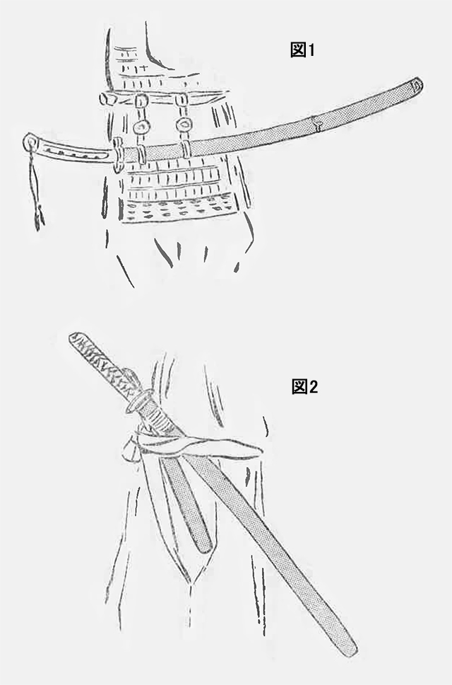 すなわちこの時代までは武士の刀剣佩用法は、図1の如く太刀として刃部を下に向けて腰に佩き吊るされていたのであります。それがこの時代から図2の如く刀と称して帯の間に刃部を上に向けて差す様になったのであります。(2).jpg)