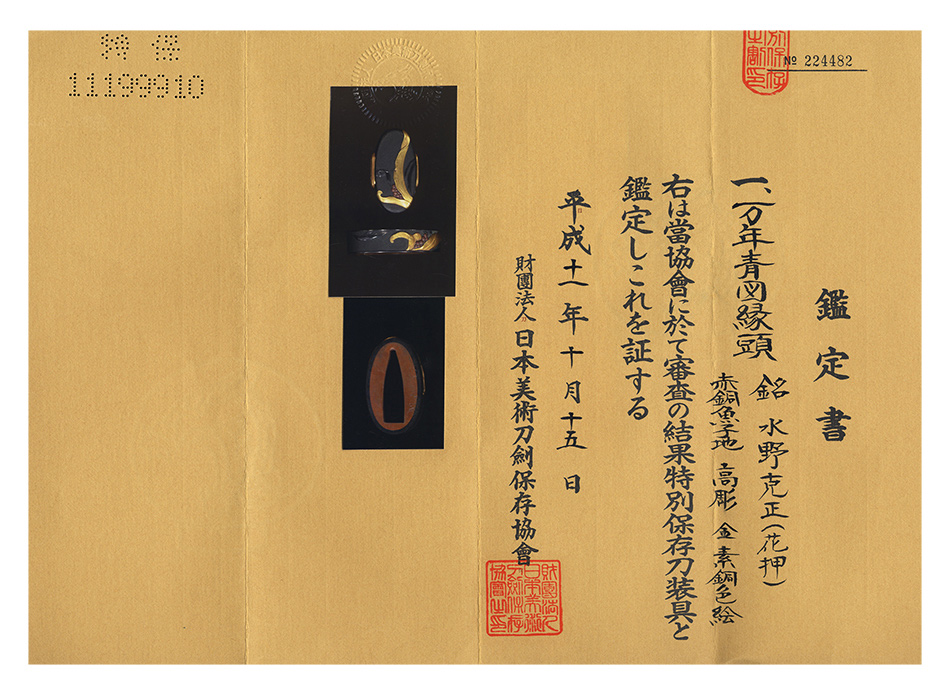 縁頭 銘 水野克正(花押) 万年青縁頭 特別保存刀装具鑑定書