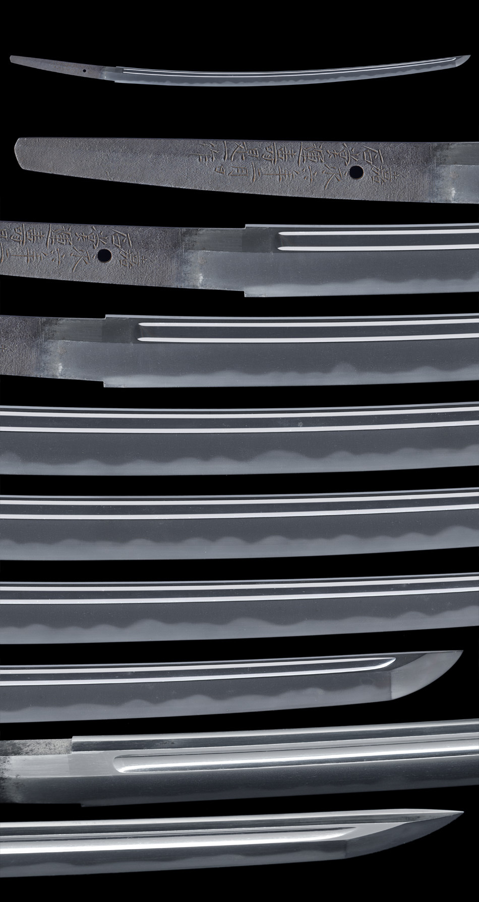 【解説】身幅やや広く、重ねは尋常。腰反りごころある刀姿の一振りである。表裏には棒樋を彫りハバキ上で丸留めとする。地鉄は、小板目肌よく詰んで地沸付き地景入る。刃文は互の目に丁子刃交え小沸よくつく。刃中は足入り、砂流し掛かり盛んな働きを見せる。帽子は乱れ込んで小丸へと返る。 |