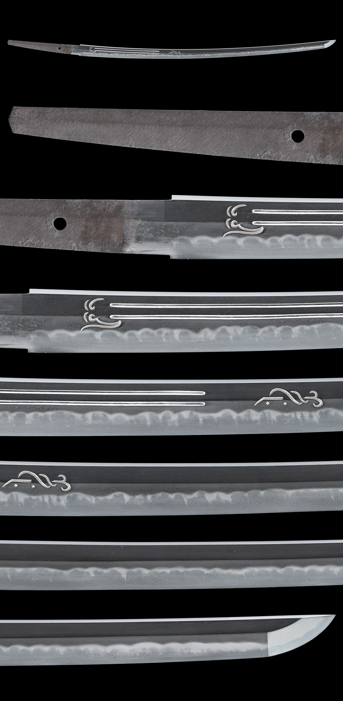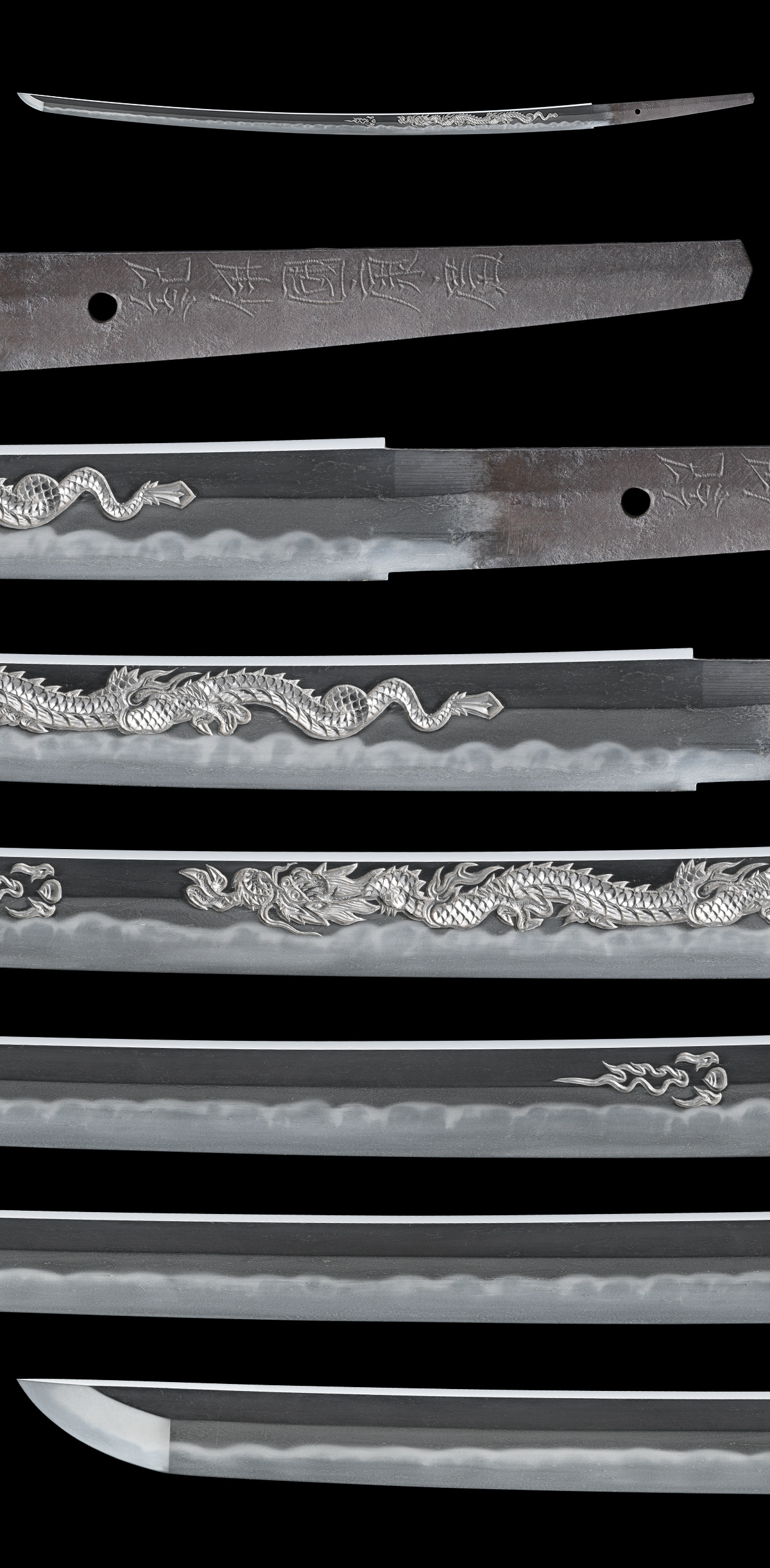 体配:Shape(Taihai): 鎬造、庵棟、中切先。 彫刻:Engraving : 表に珠追龍、裏に梵字、爪付きの護摩箸を彫刻する。 地鉄:Jigane(Hada): 板目肌良く練れて詰み、杢目交じり、一部流れごころに地沸付き、地景入り、映り立つ。 刃文:Temper patterns(Hamon): 丁子乱れを主調に互の目、角ばった刃、尖り刃交じる。 帽子:Temper patterns in the point(Bohshi): 浅く乱れて先小丸に僅かに返る。 登録:Registration Card: 東京都