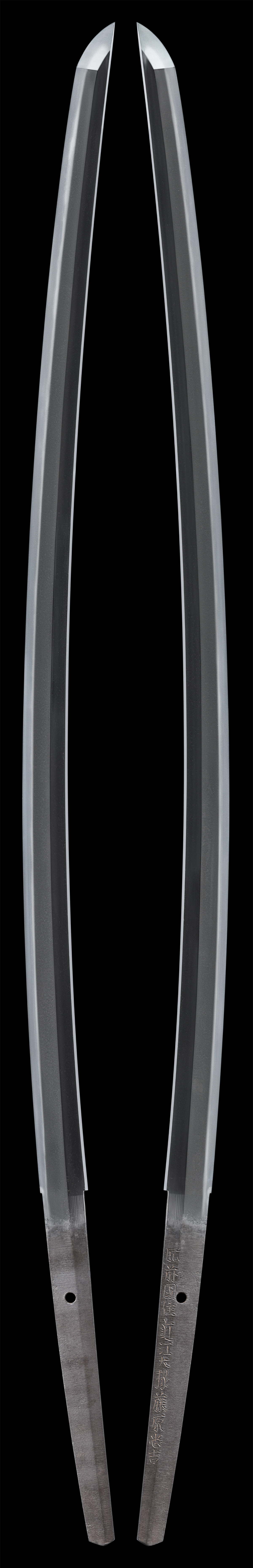 【解説】 近江大掾忠吉は、寛文八年に三代陸奥守忠吉の子として生まれます。肥前忠吉正系四代目であります。名を橋本源助、後に新三郎と称します。元禄十三年に近江大掾を受領。近江大掾藤原忠吉、肥前国住近江大掾藤原忠吉などと刻銘しました。同工は、父である三代忠吉が貞享三年、四代忠吉が十九歳の時に早世したため、元禄六年に祖父二代忠広が亡くなるまで、二代忠広に就いて鍛刀技法を学びました。作風は、二代忠広に近いものが多くみられ、二代の代作と思われる作品も残っています。四代近江大掾忠吉もまた祖父忠広と同じく長寿であり、享年八十歳、延享四年九月九日に没しました。 本作は、刃長が二尺三寸一分半、身幅重ね共に尋常、反り適度、鎬筋が凛と立って、中切っ先となる健全な刀姿の一口です。地鉄は小杢目肌に地沸付き、精良で美しい肌合いを示します。刃文は直刃で、刃縁に小沸がふんわりと付き、匂口深く、切っ先まで均一に整った焼刃となります。帽子はそのまま直ぐで先小丸に返ります。茎は生ぶ、切鑢目で、刀工銘を切ります。拵は、鞘が黒石目地塗、揃鉄金具を配した半太刀拵です。本刀は四代忠吉の一作。麗しい肥前肌に明るく冴えた直刃を焼き、肥前刀ならではの魅力を備えた同工の優品としてご紹介いたします。白鞘、金銀着二重はばき、黒石目地塗鞘半太刀拵、特別保存刀剣鑑定書。