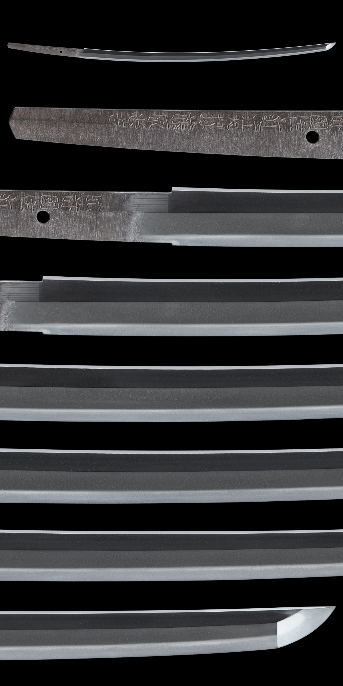 体配:Shape(Taihai): 鎬造、庵棟、中切先。 地鉄:Jigane(Hada): 小杢目肌。 刃文:Temper patterns(Hamon): 直刃。 帽子:Temper patterns in the point(Bohshi): 直ぐで先小丸に返る。 登録:Registration Card: 熊本県 昭和二十六年