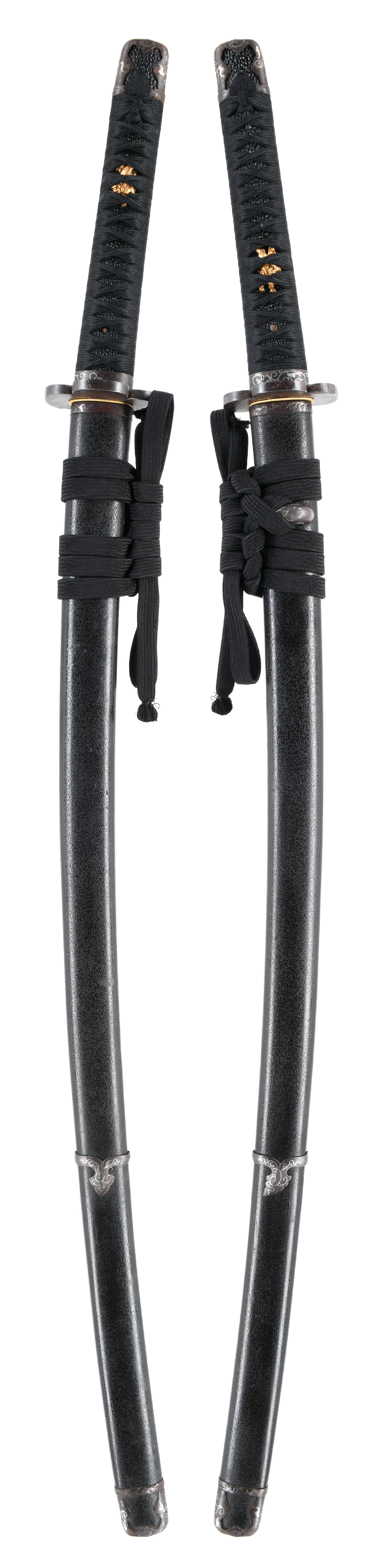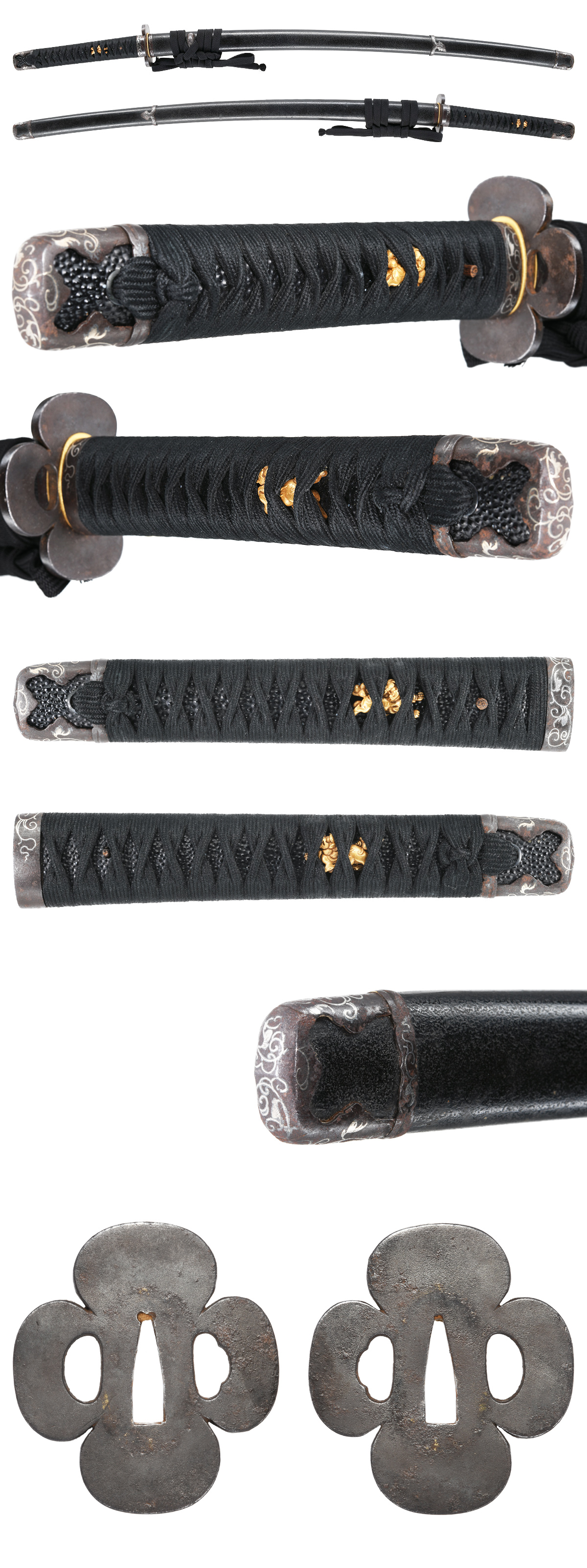 刃長:Blade length(Cutting edge): 70.1cm(二尺三寸一分半) 反り:Curve(SORI): 1.9cm 元幅:Width at the hamachi(Moto-Haba): 2.88cm 元鎬重:Thickness at the Moto-Kasane: 0.66cm 先幅:Wide at the Kissaki(Saki-Haba): 2.40cm 先鎬重:Thickness at the Saki-Kasane: 0.55cm 拵全長:Length of Koshirae : 約98cm 茎:Sword tang(Nakago): 生ぶ、切鑢目、目釘孔1個。