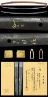 刃長:Blade length(Cutting edge): 73.7cm(二尺四寸三分) 反り:Curve(SORI): 1.6cm 元幅:Width at the hamachi(Moto-Haba): 2.85cm 元鎬重:Thickness at the Moto-Kasane: 0.76cm 先幅:Wide at the Kissaki(Saki-Haba): 2.10cm 先鎬重:Thickness at the Saki-Kasane: 0.55cm 茎:Sword tang(Nakago): 勝手下鑢目、目釘孔2個。