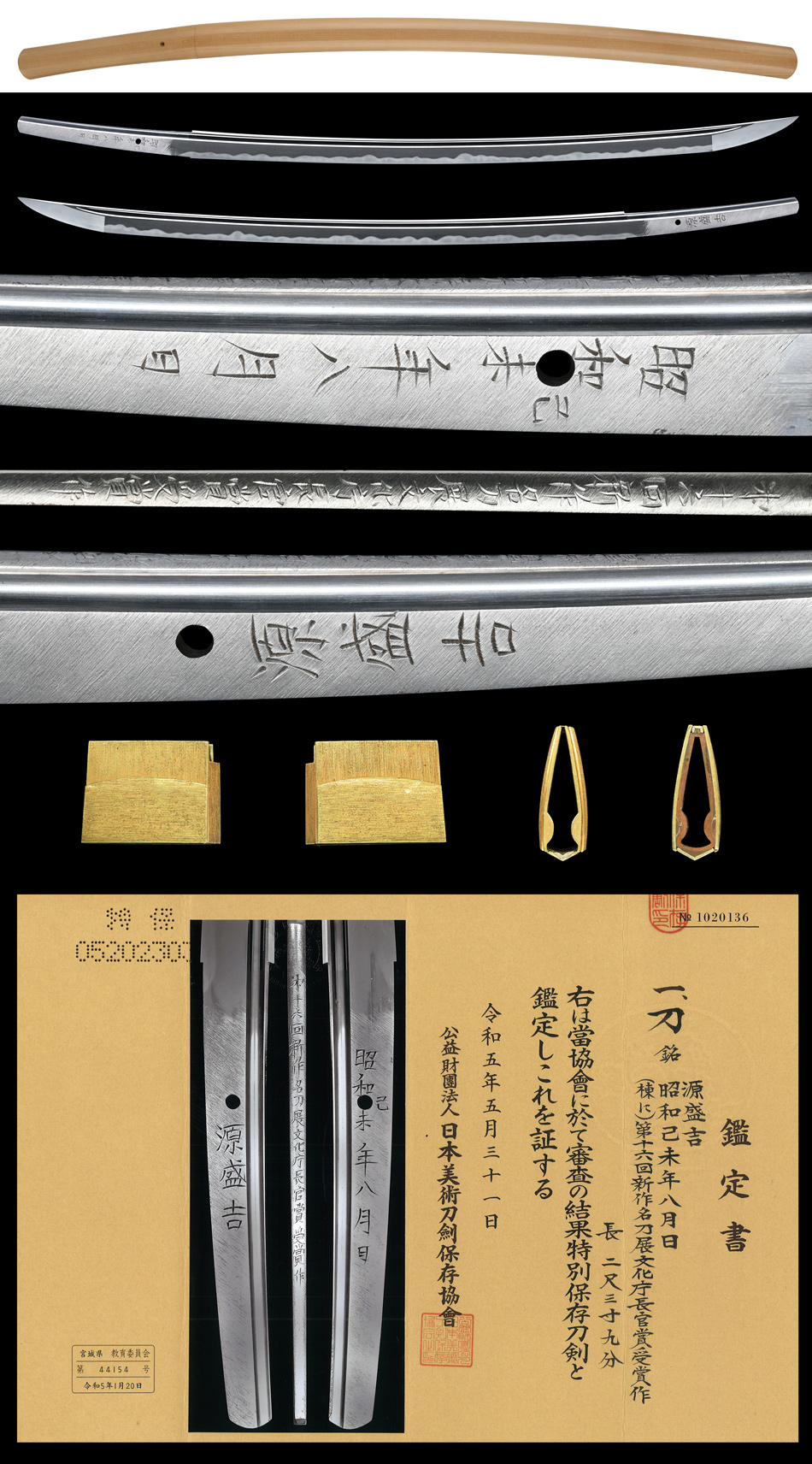 【解説】 源盛吉は本名を谷川松吉と言い、清磨写しの名人と言われた近代で最も著名な刀工です。(無監査刀匠、県指定無形文化財保持者)大正9年(1920)生まれ。熊本の八代市の刀匠で銘を源盛吉、肥州八代源盛吉などと切ります。第一回作刀技術発表会から連続出品し、源清麿写で名声を高め、昭和六十年(1985)には無鑑査刀匠となります。迫力の有る相州伝の傑作、数々の名作を残し、平成二年(1990)に惜しくも七十歳で没しています。 本刀体配は、刃長が二尺三寸九分、身幅重ね共にがっしりとし、反りは頃合いで、大切っ先となる清麿写しの堂々たる一口。地鉄は板目肌で、刃寄り流れ心、地沸厚く微塵につき、地景が強く入る、誠によく鍛錬された精強堅固な鍛であり、精緻な鉄色で、すこぶる良く冴えます。焼刃は沸出来の互の目丁子乱れが焼かれ、沸付き良く、刃中には金筋、砂流しなどが盛んに働きをみせます。爛々と輝きを放ち、同工最上の技量の粋が尽くされた焼刃です。帽子はそのまま乱れ込み、先尖り心に浅く返ります。茎には丁寧な鑢がかかり、刀工銘、年紀が刻され、棟には本刀が第十六回新作名刀展にて特賞を受賞した事を示す棟銘が切られます。清磨写しで名高い無鑑査刀匠 源盛吉。地刃が放つ同工の高技量の妙は力感に富み姿豪壮無比。同工作中随一の傑作刀であります。