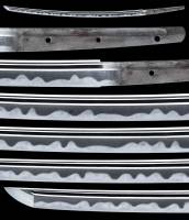 【重要刀剣図譜より】 法量 長さ七二・四糎 反り二・〇糎 元幅三・○糎 先幅二・一五糎 鋒長さ三・五糎 茎長さ二一九五糎 茎反り〇・一糎 形状 鎬造、庵棟、身幅広め、元先の幅差さまで目立たず、重ね厚く、 反り深めにつき、中鋒。 地肌 板目杢・流れ肌交り、総じて肌目立ち、地沸厚くつき、地景よく入り、淡く乱れ風の映り立つ。 刃文 総じて焼高め、互の目に丁子風の刃・尖り刃・角ばる刃など交り 、処々腰開き風となって深浅を店・業よく入り、殆ど匂出来、極く僅かに小沸つき、中程小さな湯走りを交え、金筋・砂流しかかる。 帽子 乱れこみ、表はとがりごころに小丸、裏は丸、共に小さく掃きかける。 彫物 表裏に棒樋、表は丸止め、裏は掻き流す。 茎 大磨上、先刃上がり栗尻、鑢目勝手下がり・(表茎尻辺)切り、目釘孔三、無銘、