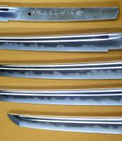 刃長:75.5cm(二尺四寸九分) 反り:2.0cm 元幅:3.38cm 元鎬重:0.65cm 先幅:2.57cm 先鎬重:0.45cm 刀身重量(裸身):730g 刀身重量(鞘を払って):1015g 茎:生ぶ、鑢目勝手下がり、目釘孔一 体配:中切先、鎬造、庵棟、樋入。 地鉄:小板目つみ地沸付く。 刃文:互の目に丁子交える。 帽子:直ぐになり、先小丸に返る。 登録:福岡県 昭和55年