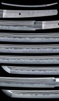 刃長:Blade length(Cutting edge): 79.6cm(二尺六寸二分六厘) 反り:Curve(SORI): 3.0cm 元幅:Width at the hamachi(Moto-Haba): 3.33cm 元鎬重:Thickness at the Moto-Kasane: 0.81cm 先幅:Wide at the Kissaki(Saki-Haba): 2.65cm 先鎬重:Thickness at the Saki-Kasane: 0.55cm 茎:Sword tang(Nakago):生ぶ、化粧筋違鑢目、目釘孔1個。 体配:Shape(Taihai): 鎬造、庵棟、中切先。 地鉄:Jigane(Hada): 板目肌に杢目を交える。 刃文:Temper patterns(Hamon): 丁子乱れ。 帽子:Temper patterns in the point(Bohshi): 乱れて先小丸へ返る 登録:Registration Card: 石川県