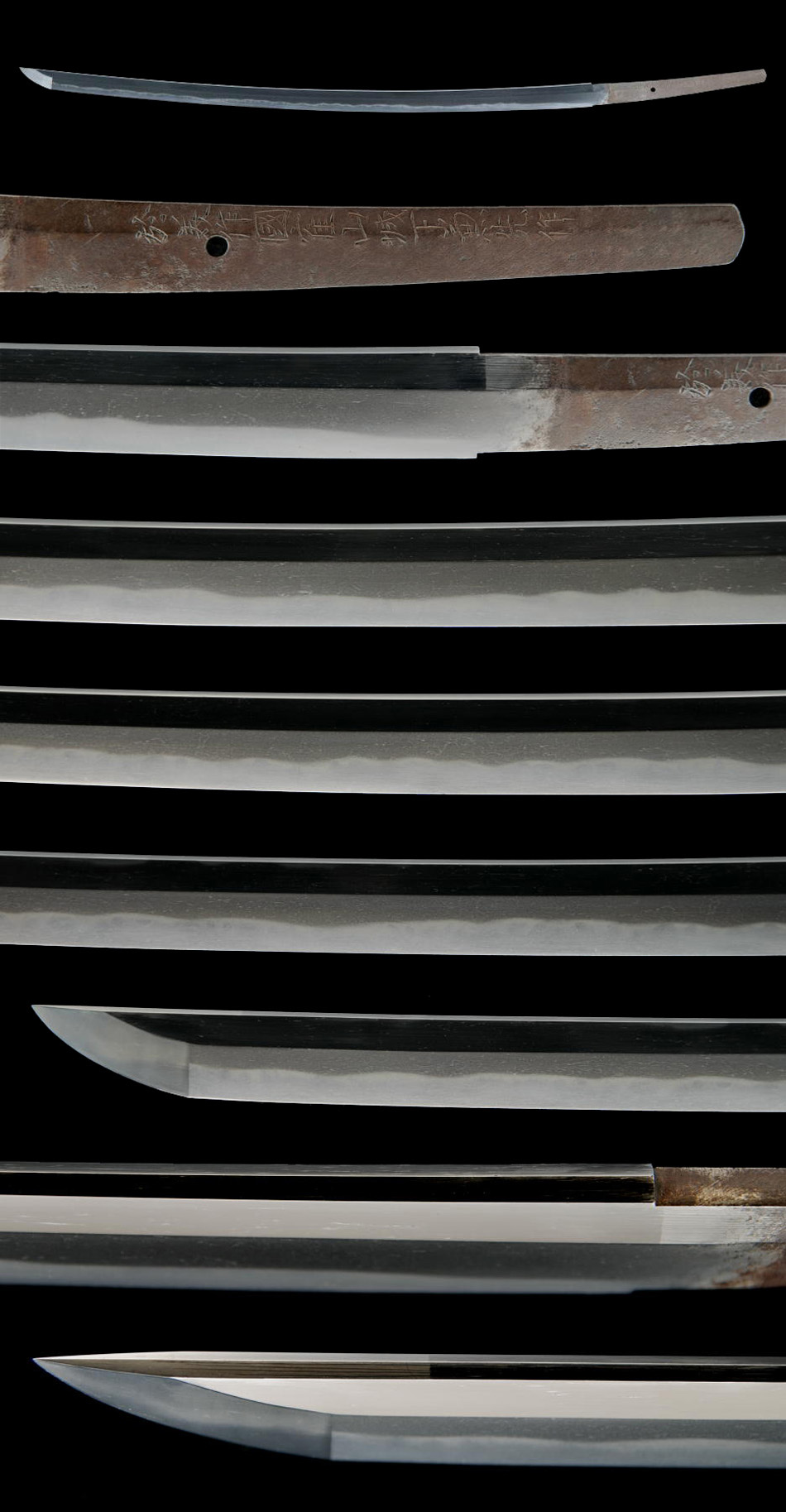 刃長:69.7cm(二尺三寸) 反り:1.9cm 元幅:3.1cm 元鎬重:0.7cm 体配:中切先、鎬やや高く庵棟 |