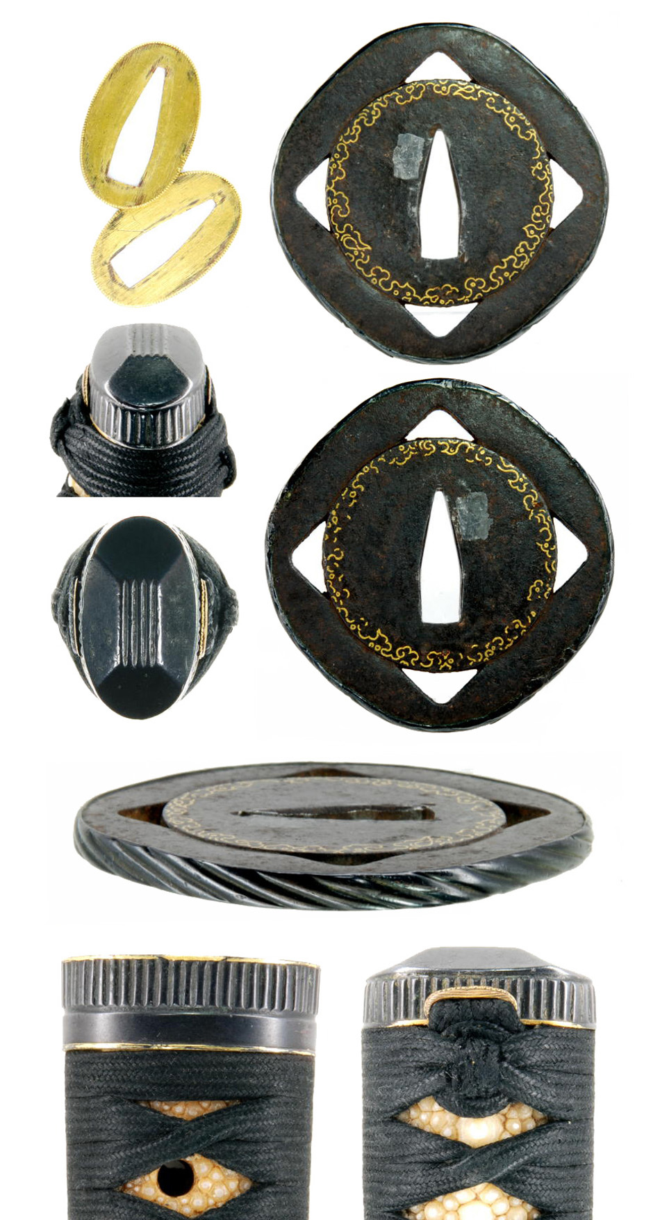 刃長:Blade length(Cutting edge): 69,7cm(二尺三寸) 反り:Curve(SORI): 2.24cm(7分4厘) 体配:Shape(Taihai): 中切先、鎬造り、庵棟、反り有り姿良し。 |