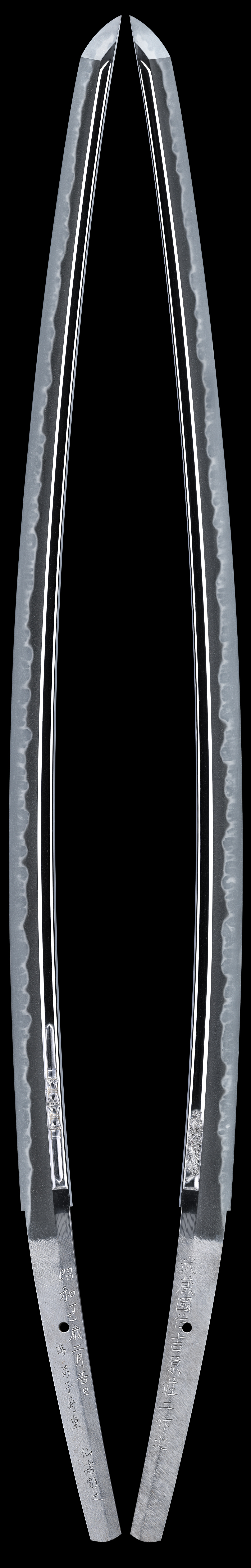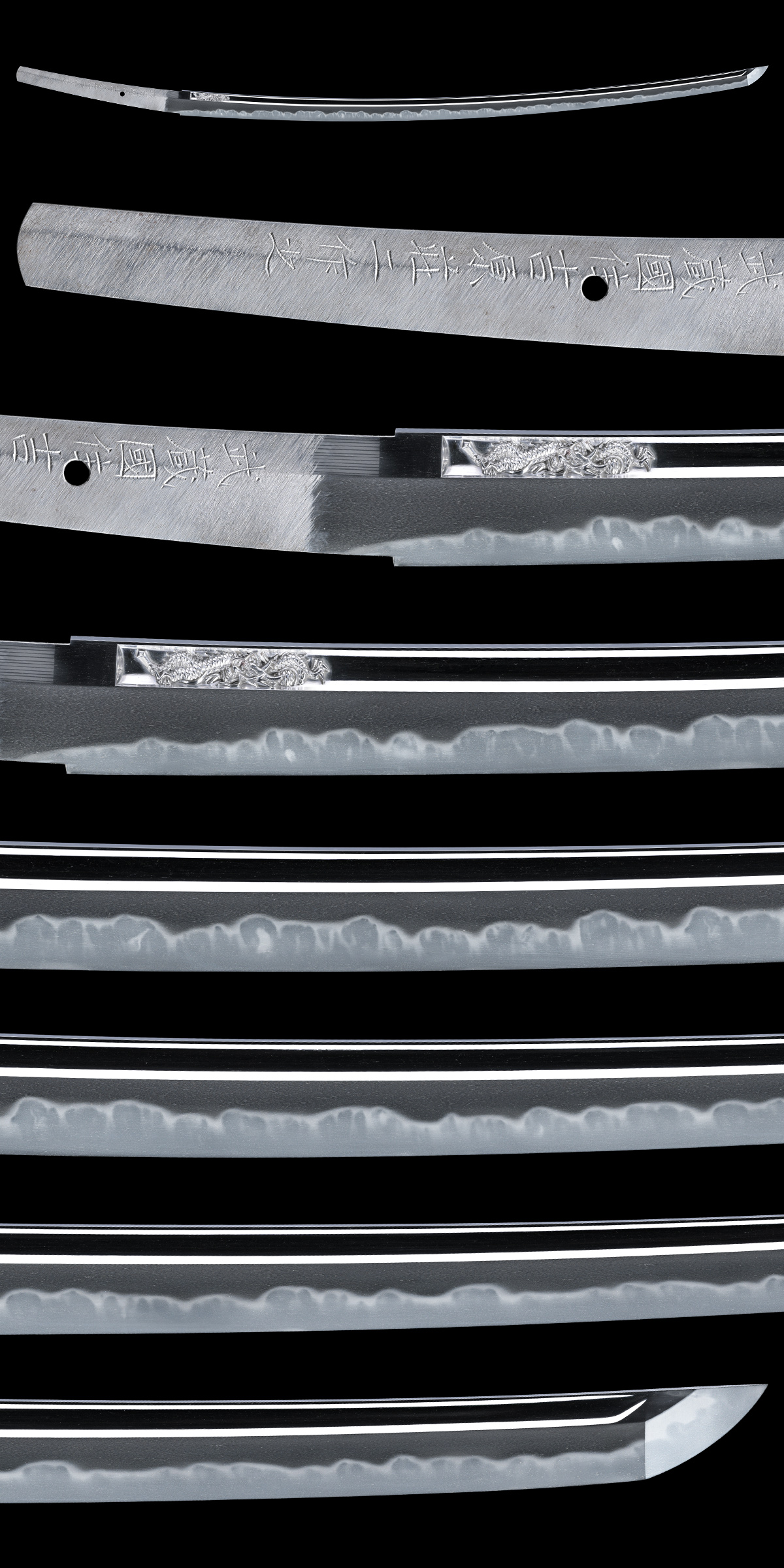 体配:Shape(Taihai): 鎬造、庵棟、中切先。 彫刻:Engraving : 表の樋内に龍、裏の樋内に独鈷杵。 地鉄:Jigane(Hada): 小板目肌、地沸付き、地景入る。 刃文:Temper patterns(Hamon): 丁子乱れ。 帽子:Temper patterns in the point(Bohshi): 乱れ込み先尖り心に返る。 登録:Registration Card:東京都