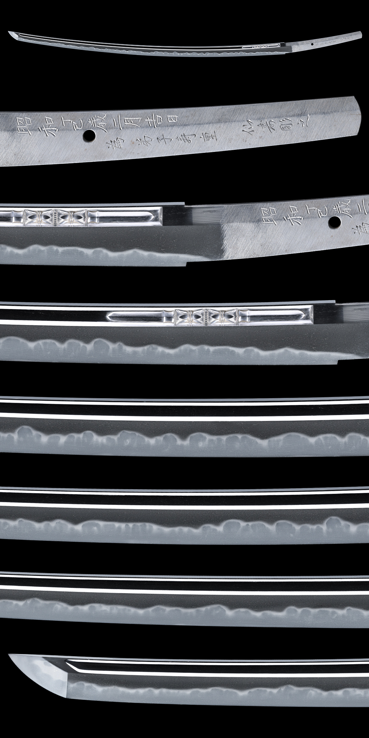 刃長:Blade length(Cutting edge): 80.4cm(二尺六寸六分弱) 反り:Curve(SORI): 2.6cm 元幅:Width at the hamachi(Moto-Haba): 3.50cm 元鎬重:Thickness at the Moto-Kasane: 0.85cm 先幅:Wide at the Kissaki(Saki-Haba): 2.65cm 先鎬重:Thickness at the Saki-Kasane: 0.60cm 茎:Sword tang(Nakago): 生ぶ、筋違鑢目、目釘孔1個。