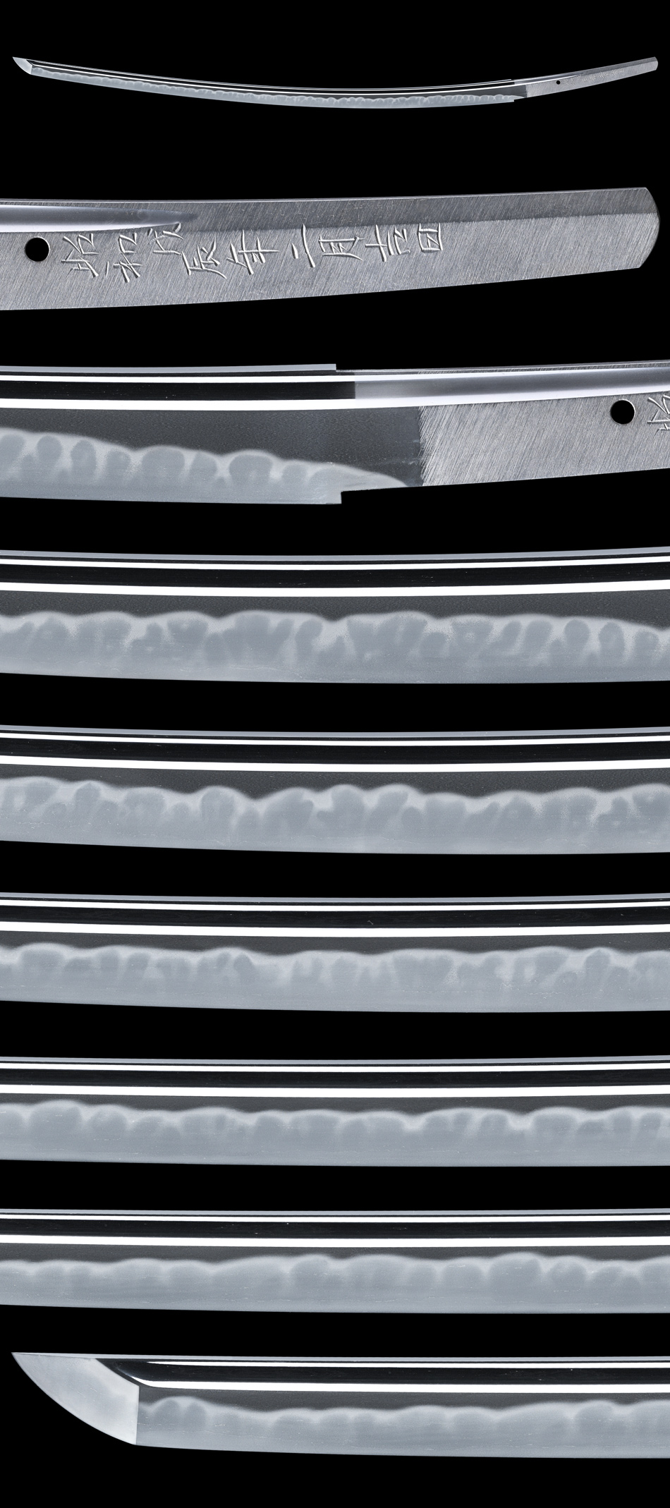 体配:Shape(Taihai): 鎬造、庵棟、中切先。 彫刻:表裏に棒樋を掻き流す。 地鉄:Jigane(Hada): 小板目肌。 刃文:Temper patterns(Hamon): 互の目丁子乱れ。 帽子:Temper patterns in the point(Bohshi): 湾れて先僅かに尖り返る。 登録:Registration Card: 神奈川県