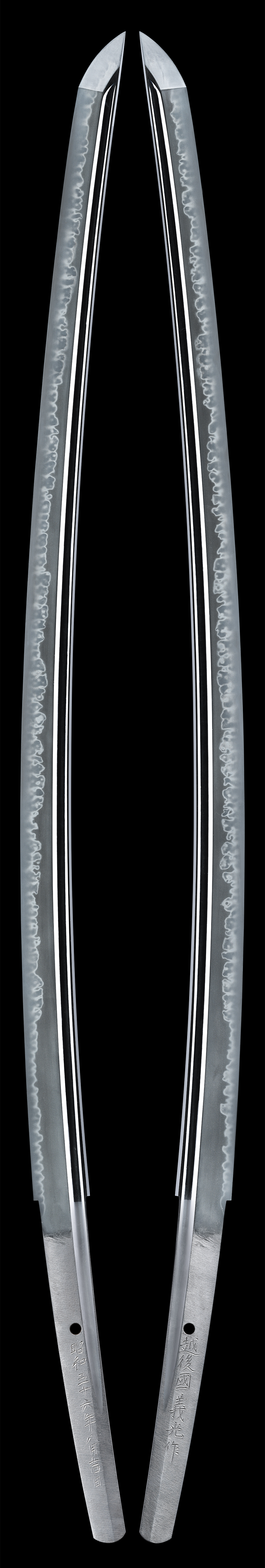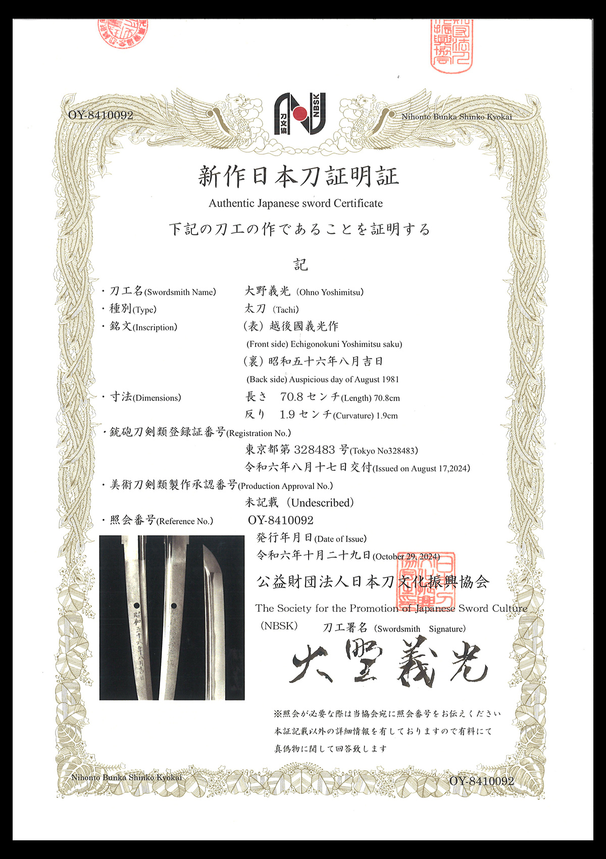 【解説】 大野義光刀匠は、昭和二十三年(1948)、新潟県西蒲原郡黒埼町(現新潟市)生まれ、本名を吉川三男といいます。大学在学中に刀匠を志し、昭和四十四年(1969)より吉原義人刀匠に師事し、昭和五十年(1975)に作刀承認を受け、同年新作名刀展に初出品を果たし、奨励賞を受賞します。翌五十一年(1976)、新潟県黒埼町に自身の鍛錬場を設立されました。新作名刀展への初出品以降、努力賞、高松宮賞や文化庁長官賞をはじめ数々の栄誉を受け、昭和五十九年(1984)に伊勢神宮の御神刀を製作、昭和六十二年(1987)、無鑑査刀匠に認定されました。国内外で個展を開かれ、精力的に活動をされており、平成二十四年(2012)に葛飾区指定無形文化財に認定、令和五年(2023)には、公益財団法人日本刀文化振興協会 理事長に就任されました。義光刀匠の作柄は、備前伝を得意とし、同工の類まれな鍛錬技術をもって生み出される誠に華やかな重花丁子乱れは、「大野丁子」と称されます。代表作に上杉家伝来の国宝 山鳥毛写しがあって、国内のみならず海外からも高い評価を得ています。 本刀体配は刃長が二尺三寸三分、身幅元先で広く、反り高くつき、ふくら豊かな中切っ先となるなど豪壮な太刀姿となります。表裏に棒樋を掻き流します。地鉄は、小板目肌に地沸付き、澄んで潤いのある鍛です。刃文は、大小の丁子が乱れ、重花丁子となり、焼き高く、大変華やかな焼刃を呈し、匂口明るく冴えます。帽子はそのまま乱れ込み返ります。無鑑査刀匠 大野義光先生の出色の逸品。本工の得意とする華麗な重花丁子乱れが、大変惹きつけられる見所の傑作です。白鞘、銀無垢二重はばき、新作日本刀証明証。