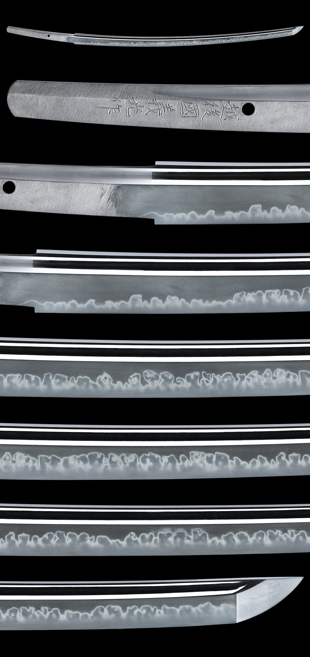 体配:Shape(Taihai): 鎬造、庵棟、中切先。 彫物:Engraving: 表裏に棒樋を掻き流す。 地鉄:Jigane(Hada): 小板目肌。 刃文:Temper patterns(Hamon): 大小の丁子が乱れて重花丁子となる。 帽子:Temper patterns in the point(Bohshi): 乱れ込み返る。 登録:Registration Card: 東京都