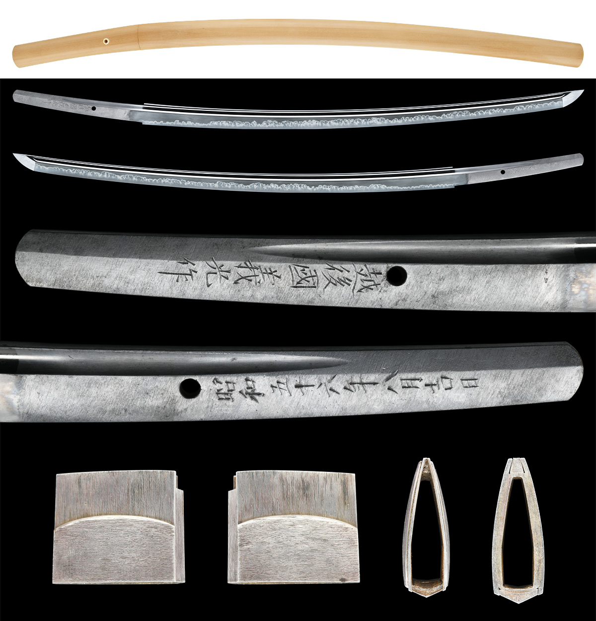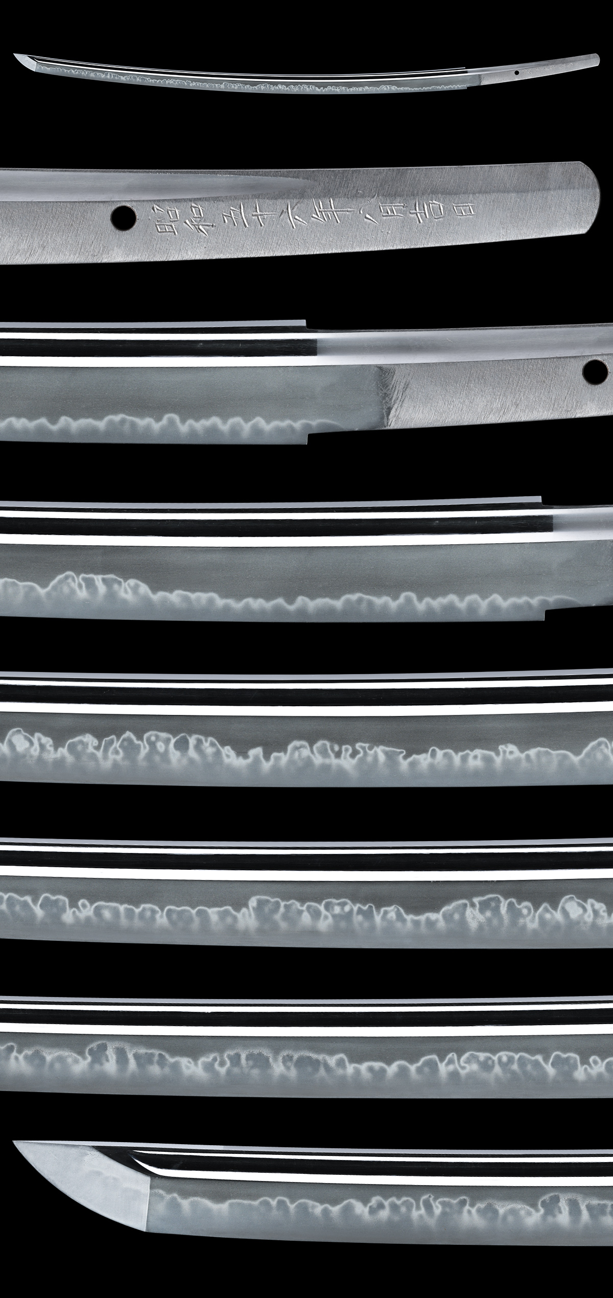 刃長:Blade length(Cutting edge):70.8cm(二尺三寸三分) 反り:Curve(SORI): 1.9cm 元幅:Width at the hamachi(Moto-Haba): 3.45cm 元鎬重:Thickness at the Moto-Kasane:0.82cm 先幅:Wide at the Kissaki(Saki-Haba): 2.65cm 先鎬重:Thickness at the Saki-Kasane:0.70cm 茎:Sword tang(Nakago): 生ぶ、勝手下がり鑢目、目釘孔1個。