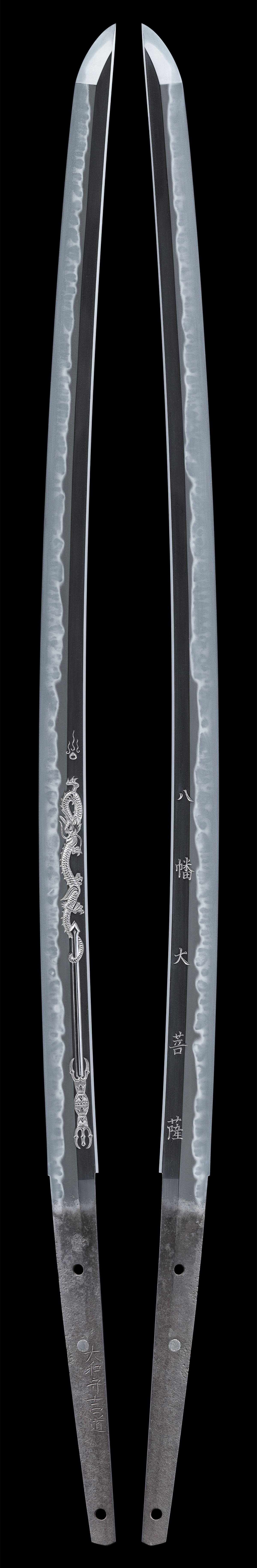 体配:Shape(Taihai): 鎬造、庵棟、中切先。 彫刻:Engraving : 表に龍と三鈷柄剣に宝珠、裏に八幡大菩薩の彫刻を施す。 地鉄:Jigane(Hada): 小板目肌。 刃文:Temper patterns(Hamon): 丁子乱れ。 帽子:Temper patterns in the point(Bohshi): 直ぐで先小丸に返る。 登録:Registration Card:東京都 昭和三十一年
