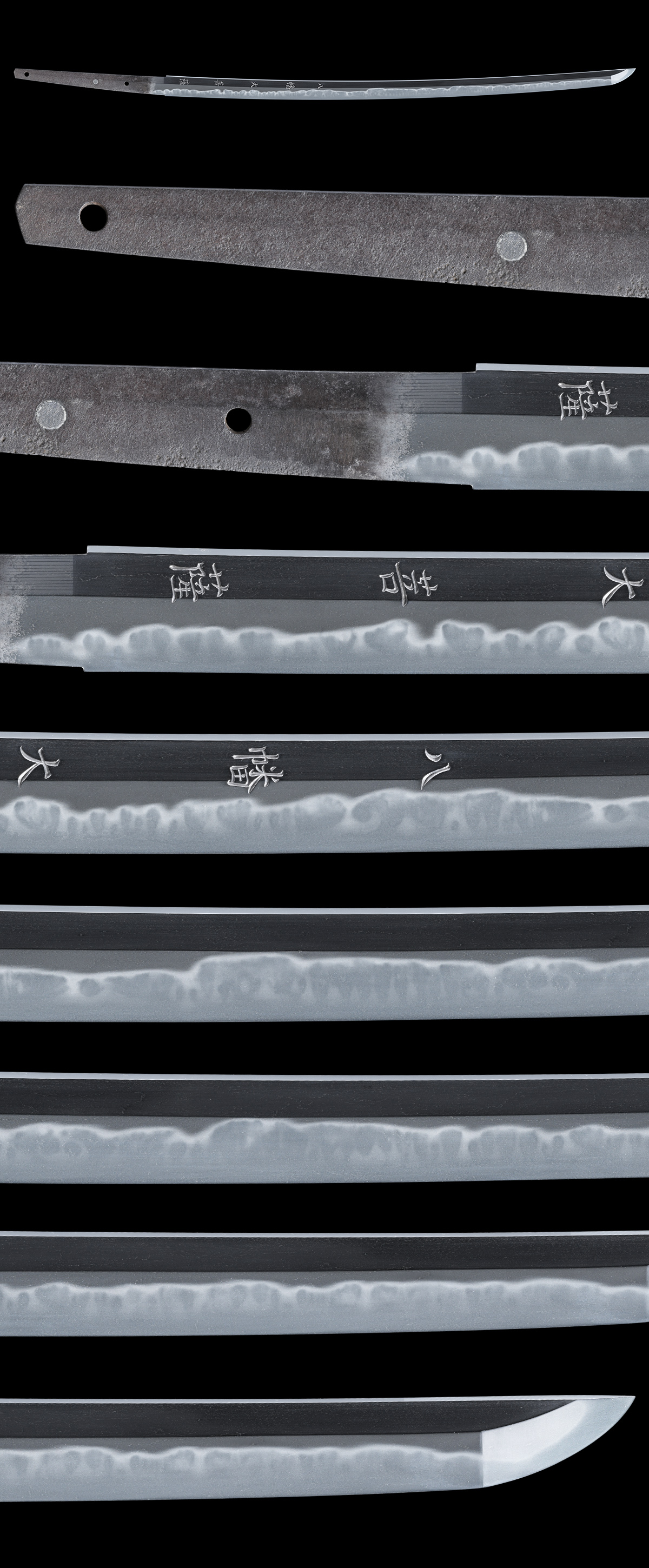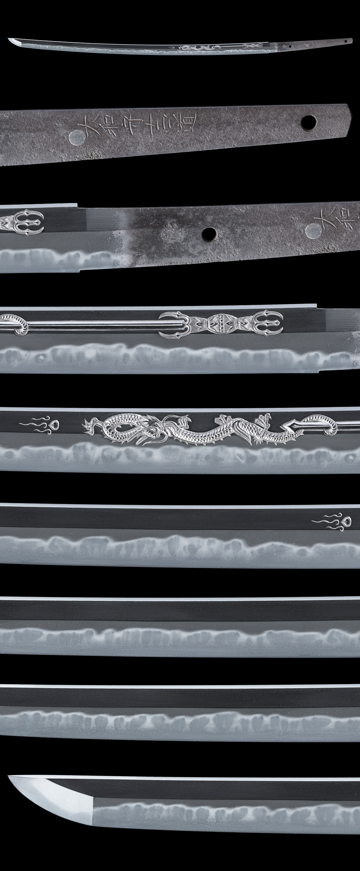【解説】 初代大和守吉道は、本名を三品宇左衛門といいます。初代大阪丹波守吉道の次男にあたり、二代河内守国助、多々良長幸と共に、関西における「丁子乱れの三名人」と称される良工です。江戸時代初期 承応頃(1652~)から延宝頃(1673~)までの年紀を切る作刀が残ります。作風は中河内に似た丁子乱れ、拳形丁子や、丹波守吉道一門の家伝である簾刃が交じるもの、濤瀾風等があります。 本作刃長は、二尺三寸三分、身幅重ね共に尋常、反り適度に中切っ先となる体配です。表に龍と三鈷柄剣、裏に「八幡大菩薩」と彫刻します。地鉄は小板目肌に地沸よく付き、綺麗に整った肌合いを呈します。刃文は総体焼きの高い丁子乱れで、処々丁子が連れて拳形丁子風となるなど、当時の大阪諸刀工にみられる所作が感ぜられます。帽子は、直ぐとなり先小丸に返ります。本刀は、初代大和守吉道の上々の一作。派手やかな丁子乱れと緻密に刻された彫刻が魅力の優刀です。