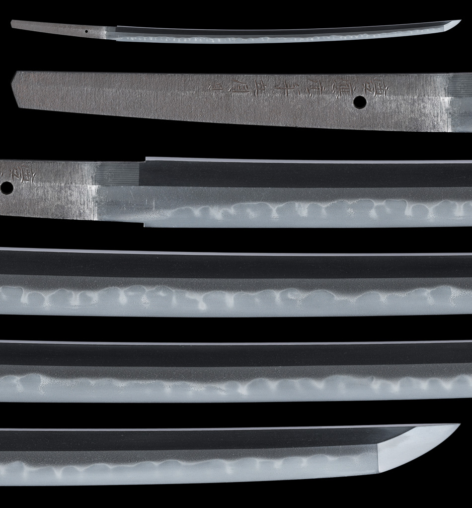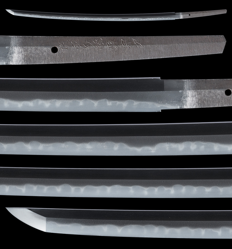 体配:Shape(Taihai): 鎬造、庵棟、中切先。 地鉄:Jigane(Hada): 小板目肌。 刃文:Temper patterns(Hamon): 互の目丁子乱れ。 帽子:Temper patterns in the point(Bohshi): 湾れて先小丸へ返る。 登録:Registration Card: 兵庫県