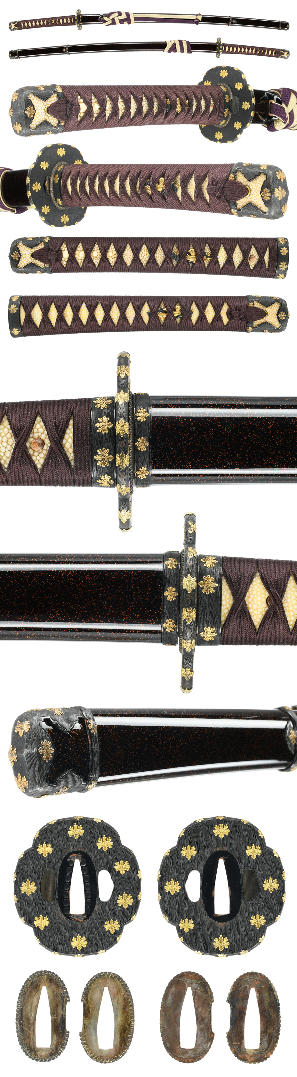 刃長:Blade length(Cutting edge): 70.7cm(二尺三寸三分半) 反り:Curve(SORI): 1.5cm 元幅:Width at the hamachi(Moto-Haba): 3.21cm 元鎬重:Thickness at the Moto-Kasane: 0.73cm 先幅:Wide at the Kissaki(Saki-Haba): 2.55cm 先鎬重:Thickness at the Saki-Kasane: 0.50cm 拵全長:Length of Koshirae : 約102.5cm 茎:Sword tang(Nakago): 生ぶ、切鑢目、目釘孔1個。