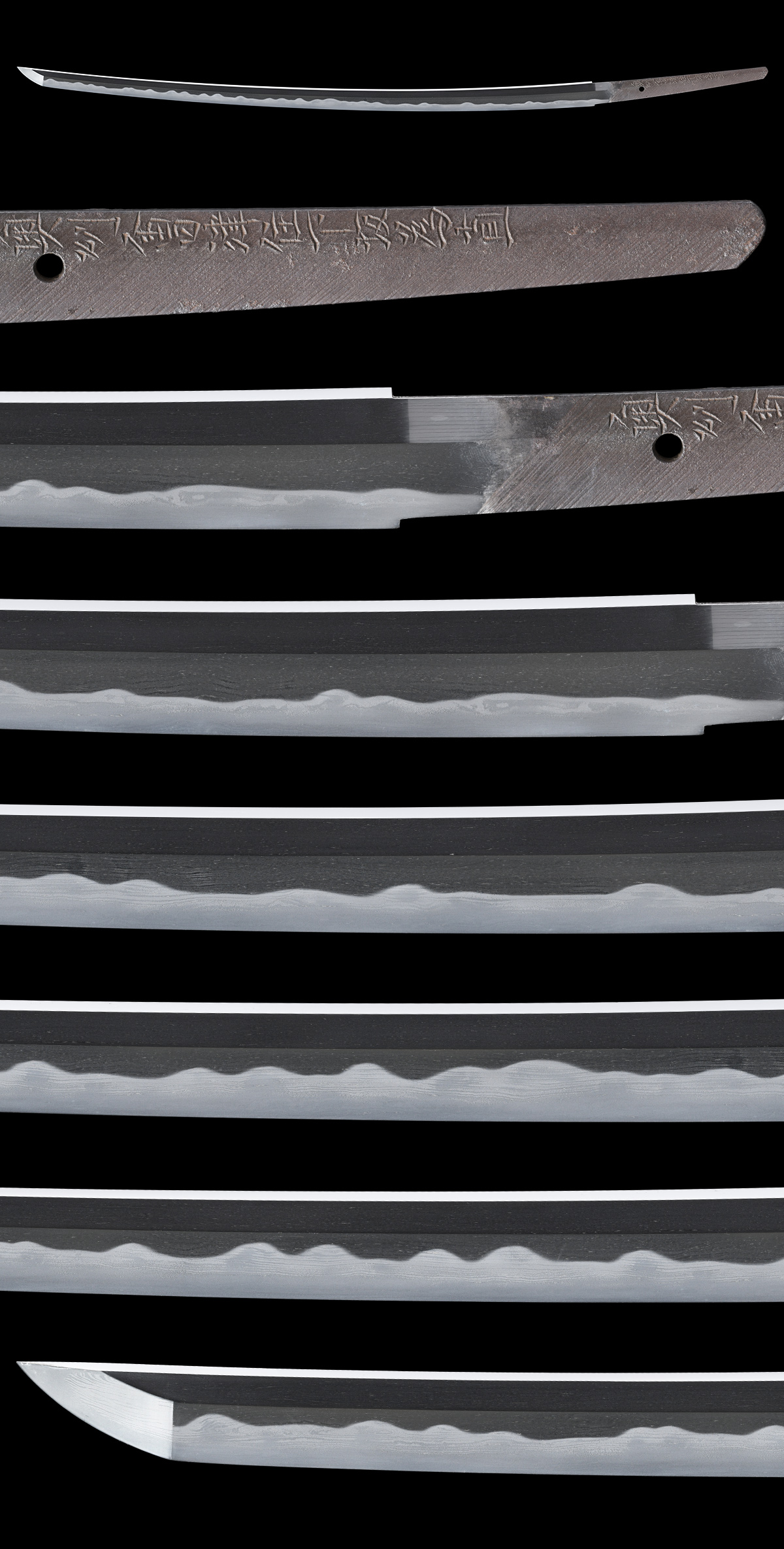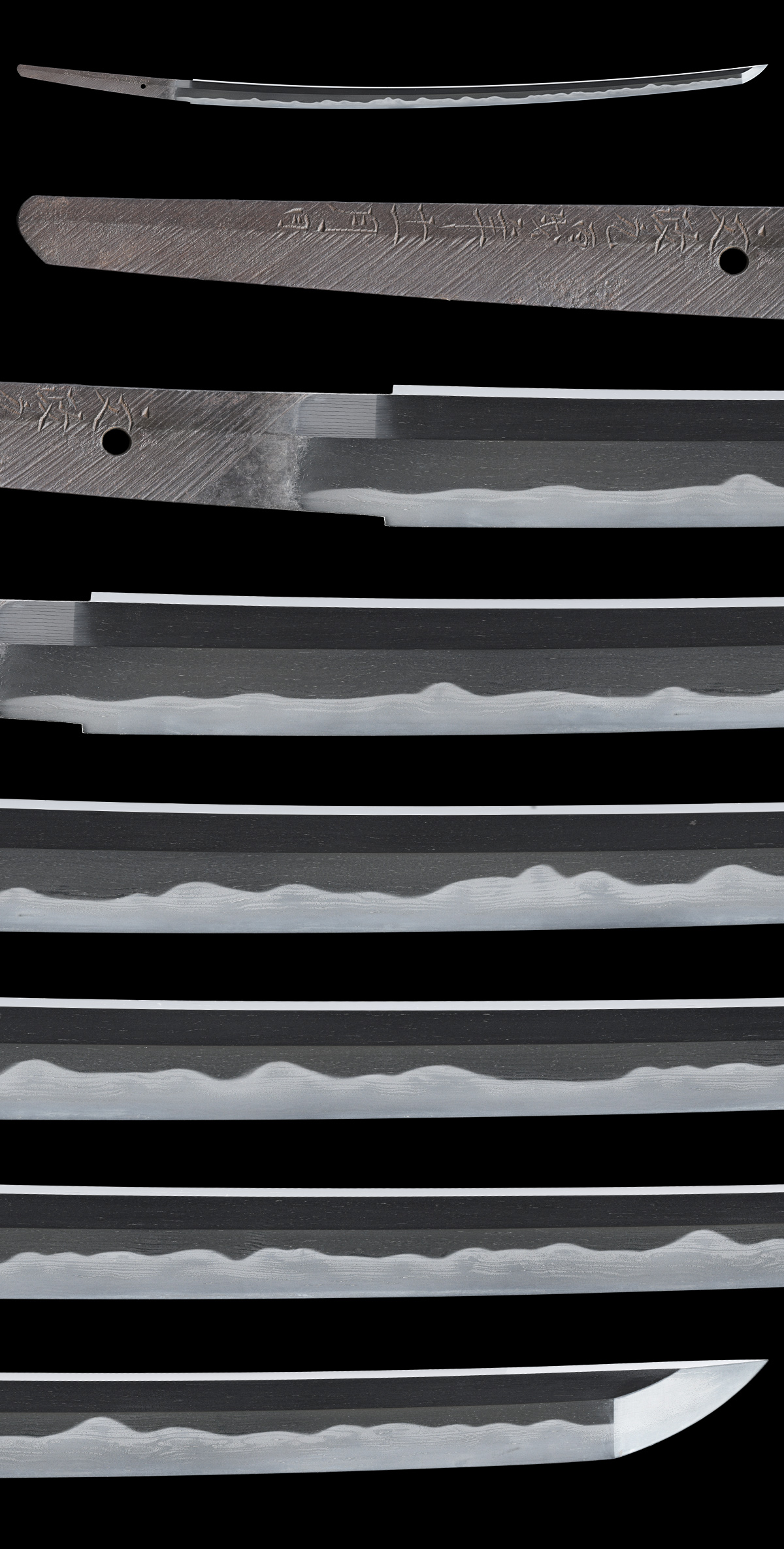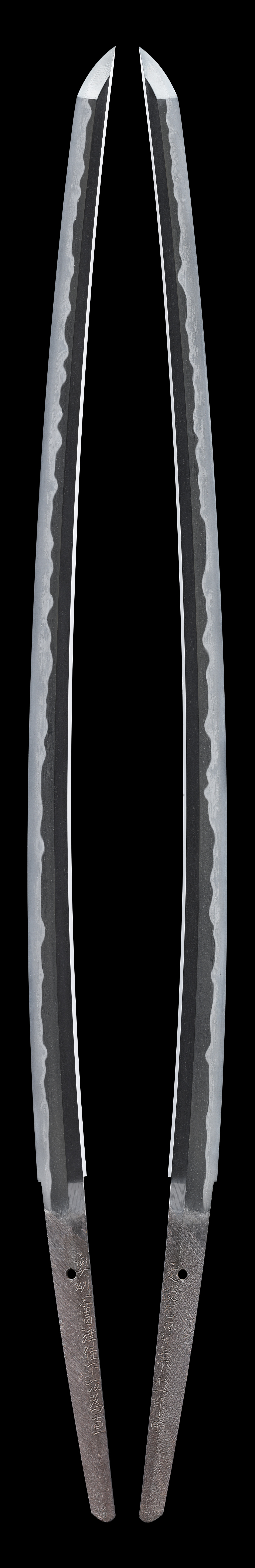 本品は、陸奥国会津(福島県)に住した下坂一派の刀工 為直の御刀です。柾目肌鍛、焼刃は互の目乱れに金筋・砂流しがよく絡んで勢いのある出来栄えを呈するなど、菜種塗拵と合わせてお楽しみいただける出来の良い一刀です。