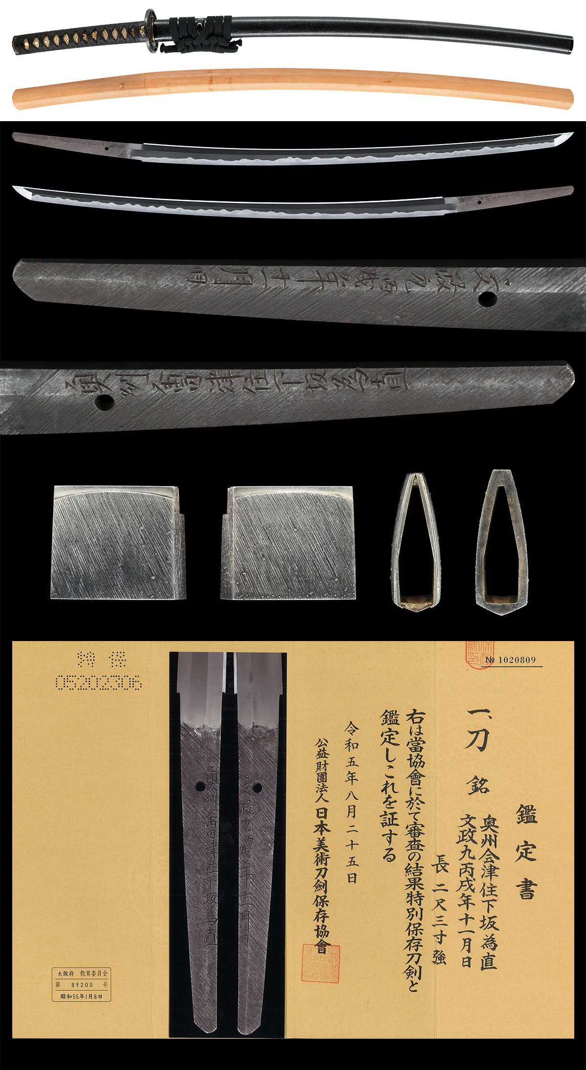 刀 奥州会津住下坂為直 文政九丙戌年十一月日 附 黒漆菜種塗鞘打刀拵 特別保存刀剣鑑定書