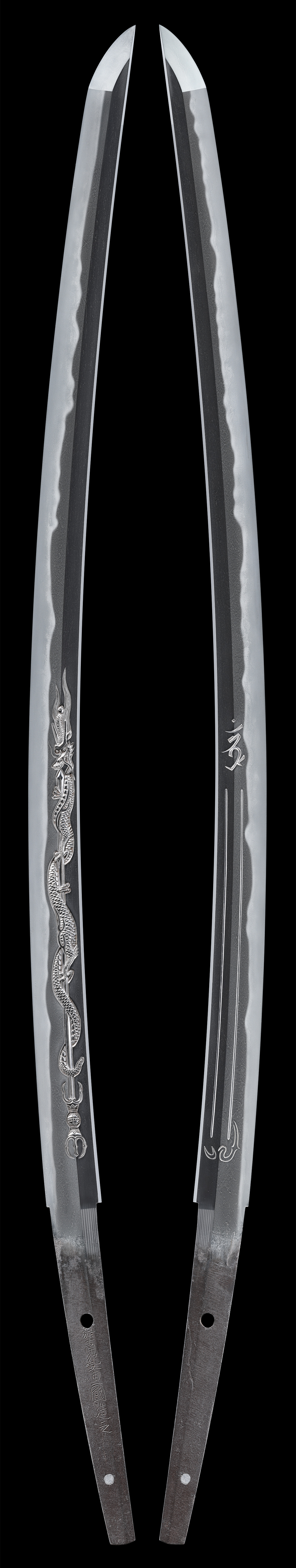 体配:Shape(Taihai): 鎬造、庵棟、中切先。 彫刻:Engraving : 表に剣巻龍、裏に梵字、爪付きの護摩箸の彫刻あり。 地鉄:Jigane(Hada): 板目に杢目交じり、一部流れごころ、地沸厚く付き、地景細かに入る。 刃文:Temper patterns(Hamon): 湾れを主として、足・互の目足など太く入り、金筋、金線掛かる。 帽子:Temper patterns in the point(Bohshi): 直ぐで先小丸に返る。 登録:Registration Card:宮崎県