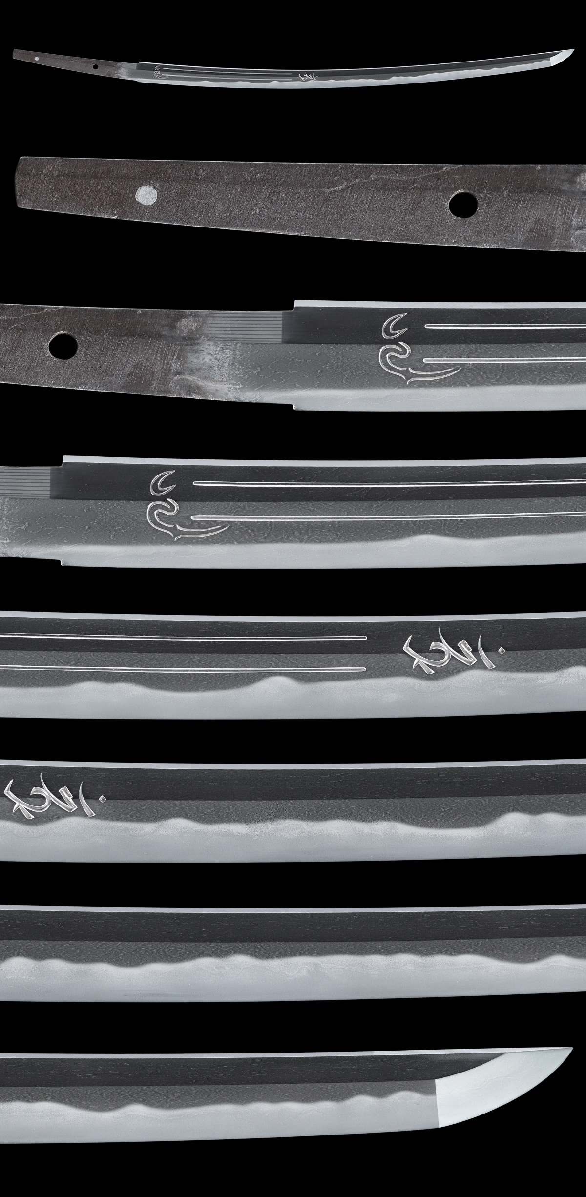 刃長:Blade length(Cutting edge): 67.5cm(二尺二寸三分弱) 反り:Curve(SORI): 2.2cm 元幅:Width at the hamachi(Moto-Haba): 3.19cm 元鎬重:Thickness at the Moto-Kasane: 0.77cm 先幅:Wide at the Kissaki(Saki-Haba): 2.60cm 先鎬重:Thickness at the Saki-Kasane: 0.55cm 茎:Sword tang(Nakago): 生ぶ、勝手下がり鑢目、目釘孔 2個中1個埋め。