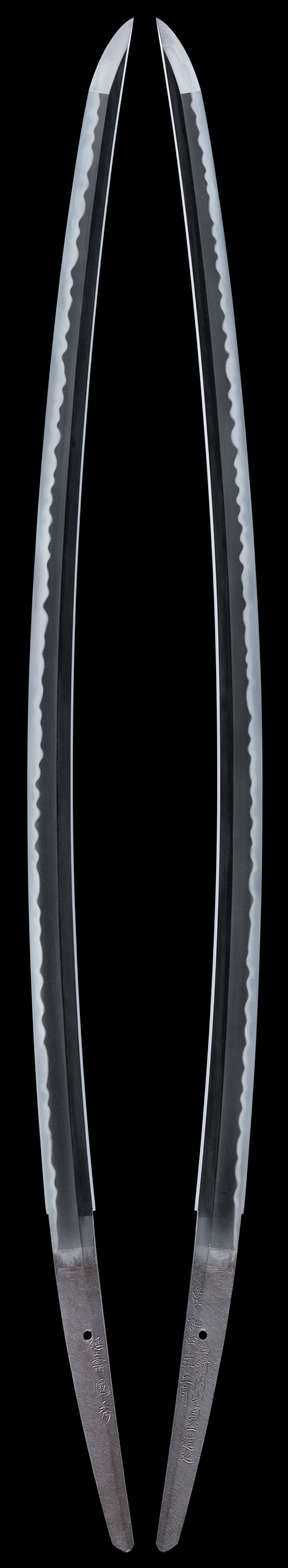 【解説】 肥後国延寿派は、大和来派・弘村の子で、山城の来国行の孫の延寿太郎国村を祖とし、鎌倉末期から南北朝期に菊池一族の招きにより肥後菊池に移り、以後同国菊地郡隈府の地に於いて大いに繁栄しました。同田貫もその末裔であると云われています。本作国秀は本名を田中寿助といい、肥後細川藩の藩工で、延寿派の末裔です。初め薩摩の藩工、伯耆守正幸に学び、後に江戸に出て水心子正秀の門人となります。水心子正秀の高い技量を継承し、直刃においても延寿派の伝統的な作域が見て取れ上手です。「延寿国秀」「東肥國日出」等と銘を切ります。 本刀は注文打ちの堂々たる一口です。体配は、刃長が二尺五寸五分弱と長寸で、身幅は尋常、重ね厚く、反り深い、中切っ先が大きく延びた、鋭く豪壮な刀姿です。地鉄は良く練られて、総体に肌がよく表れます。板目肌に杢目交じり、刃寄りは流れ心の柾風となります。刃文は小沸本位の互の目乱れで、焼頭が揃い乱れます。処々、地中の働きが刃中に入り、金線、砂流しとなって盛んに働きます。帽子は、乱れ込み先小丸へ返ります。茎は生ぶで、丁寧な化粧鑢がかかり、刀工銘と年紀、注文銘が刻されます。古刀期より連綿と続いた延寿一派の末尾を飾る同工の上出来の一口です。地鉄は肌がよく表れて、総体見所に富んだ優刀としてご紹介致します。白鞘、金着せ一重はばき。特別保存刀剣鑑定書。