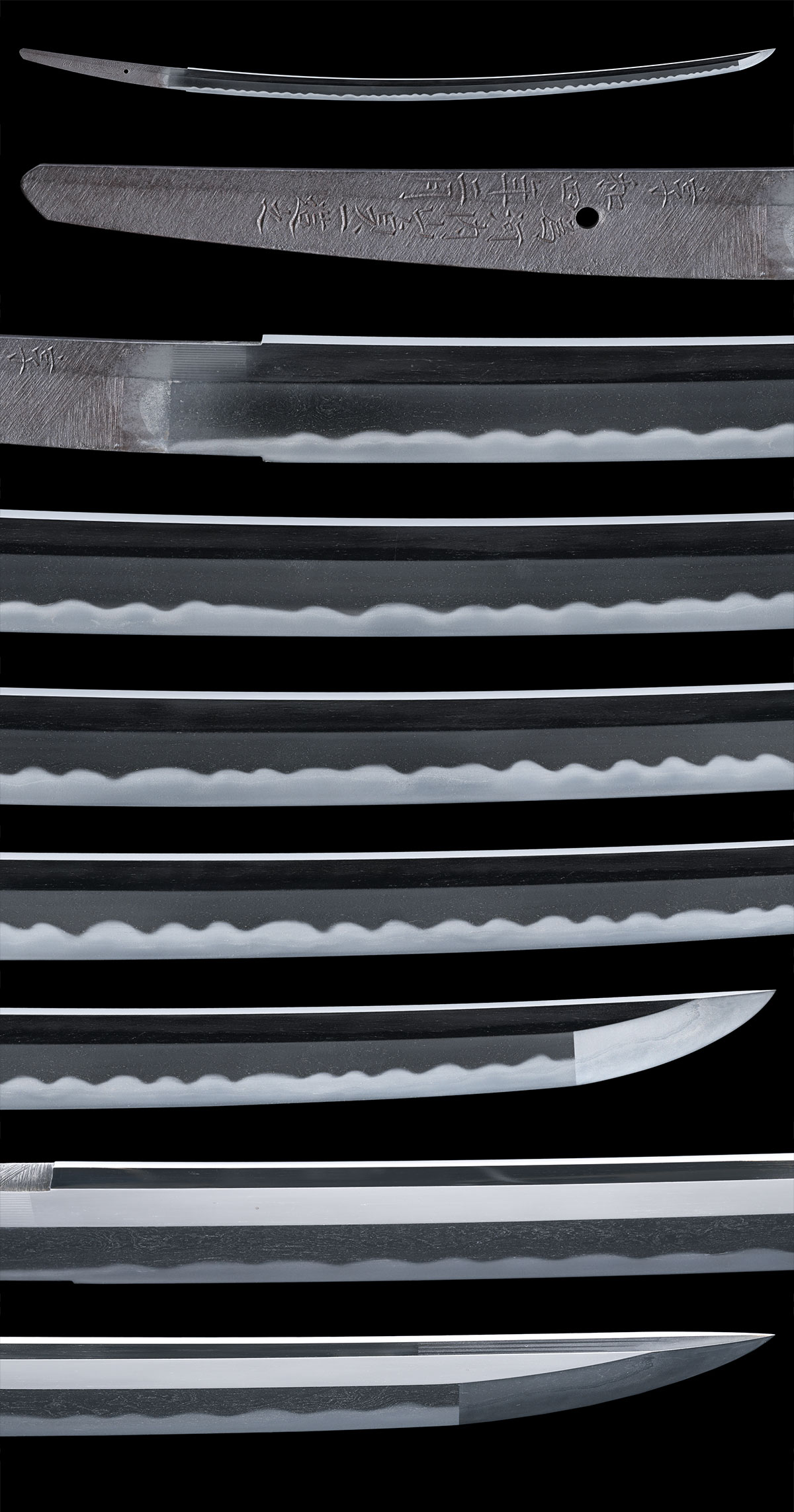 刃長:Blade length(Cutting edge): 約77.3cm(二尺五寸五分弱) 反り:Curve(SORI): 約2.1cm(七分二厘) 元幅:Width at the hamachi(Moto-Haba): 3.21cm 元鎬重:Thickness at the Moto-Kasane: 0.81cm 先幅:Wide at the Kissaki(Saki-Haba): 2.50cm 先鎬重:Thickness at the Saki-Kasane: 0.60cm 茎:Sword tang(Nakago): 生ぶ、化粧筋違鑢目、目釘孔1個。