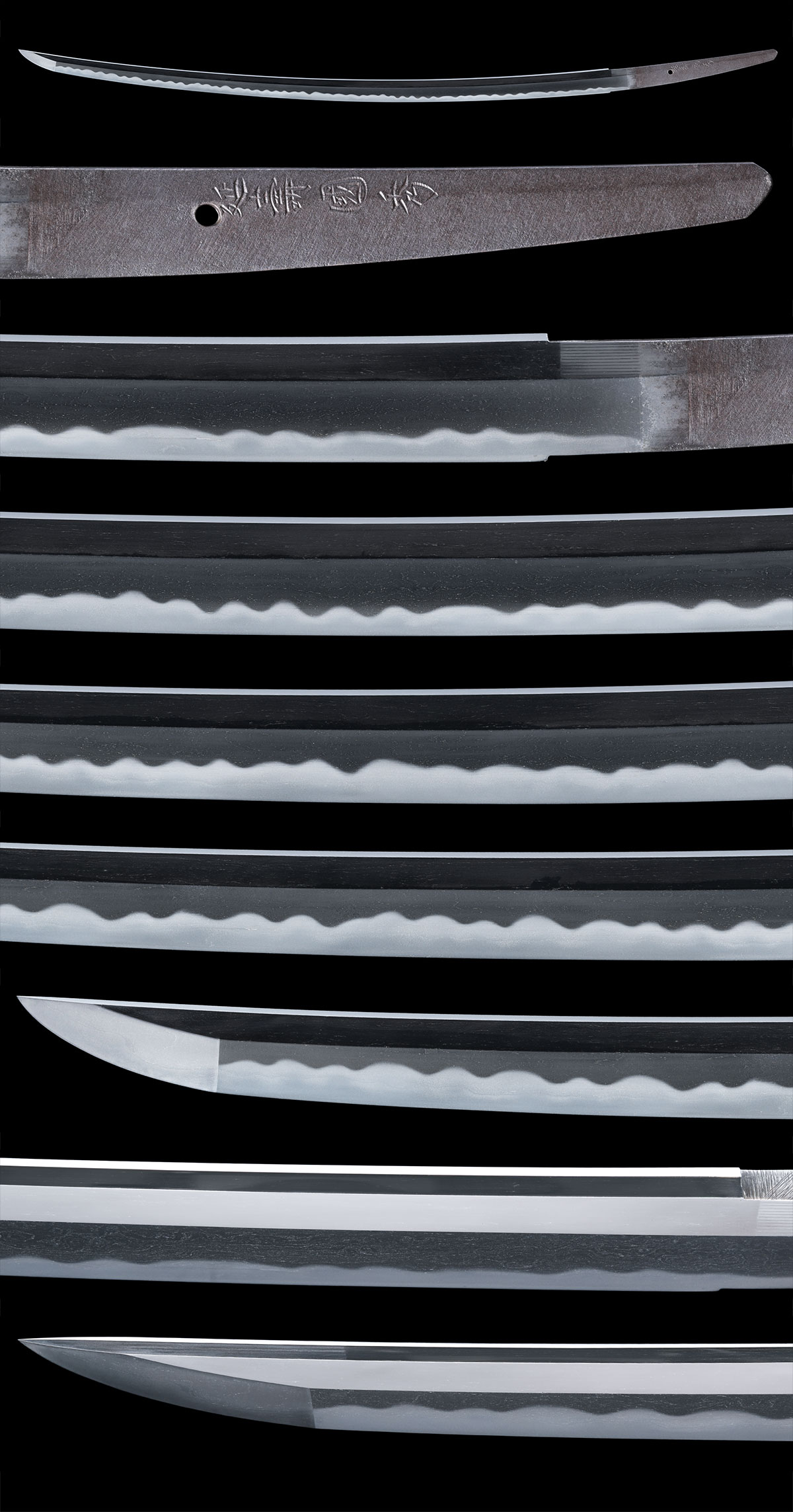 体配:Shape(Taihai): 鎬造、庵棟、中切先延びる。 地鉄:Jigane(Hada): 板目肌に杢目交じる。 刃文:Temper patterns(Hamon): 互の目乱れ。 帽子:Temper patterns in the point(Bohshi): 乱れ込んで先小丸へ返る。 登録:Registration Card: 北海道 昭和二十六年