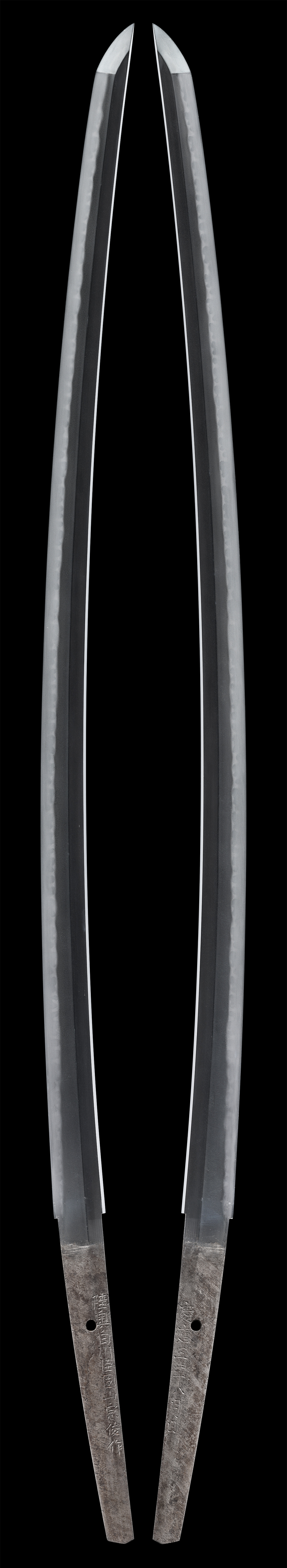 【解説】 固山宗俊は、同銘二代ありと伝え、初代は、生国奥州白川(福島県白河市)で、白竜子と号します。同国二本松古山宗次(陸奥介弘元)の門人で、江戸後期 備前伝の名手 固山宗次の一族であると伝わります。明治三年没。「奥州白川住白竜子固山宗俊」、「陸奥白川住固山宗俊作」、「陸奥住固山宗俊作」などと銘を切ります。本作は二代宗俊とみられ、初銘を宗守、文久元年、元治元年、慶応元年などに年紀を切る作が残り、明治二十一年没。父である初代宗俊との合作も記録されています。刻銘には、「陸奥守白河住人固山宗俊同宗守父子謹造」、「陸奥守白河住宗俊」、「陸奥守白河住人固山宗俊」、「陸奥白川住固山藤原宗俊作」などがあります。 本作体配は、刃長が二尺三寸二分弱、身幅重ね尋常、反り適度に利き、中切っ先となる健全で綺麗な刀姿の一振です。地鉄は小板目肌に地沸が微塵に厚く付き、総体精美な鍛を呈します。刃文は匂出来、互の目に丁子を交え、刃中には足よく働いて、総体焼頭が揃い、匂口やや締まり心に明るく冴えます。帽子は浅く乱れて先尖り心となって返ります。茎は生ぶ、化粧鑢で仕立て、刀工銘と年紀を切ります。固山宗次一門、二代固山宗俊。美しく整った小板目肌に、華麗な互の目丁子が焼かれた同工の優刀としてご紹介いたします。白鞘、銀着一重ハバキ、黒蝋色塗鞘打刀拵、特別保存刀剣鑑定書