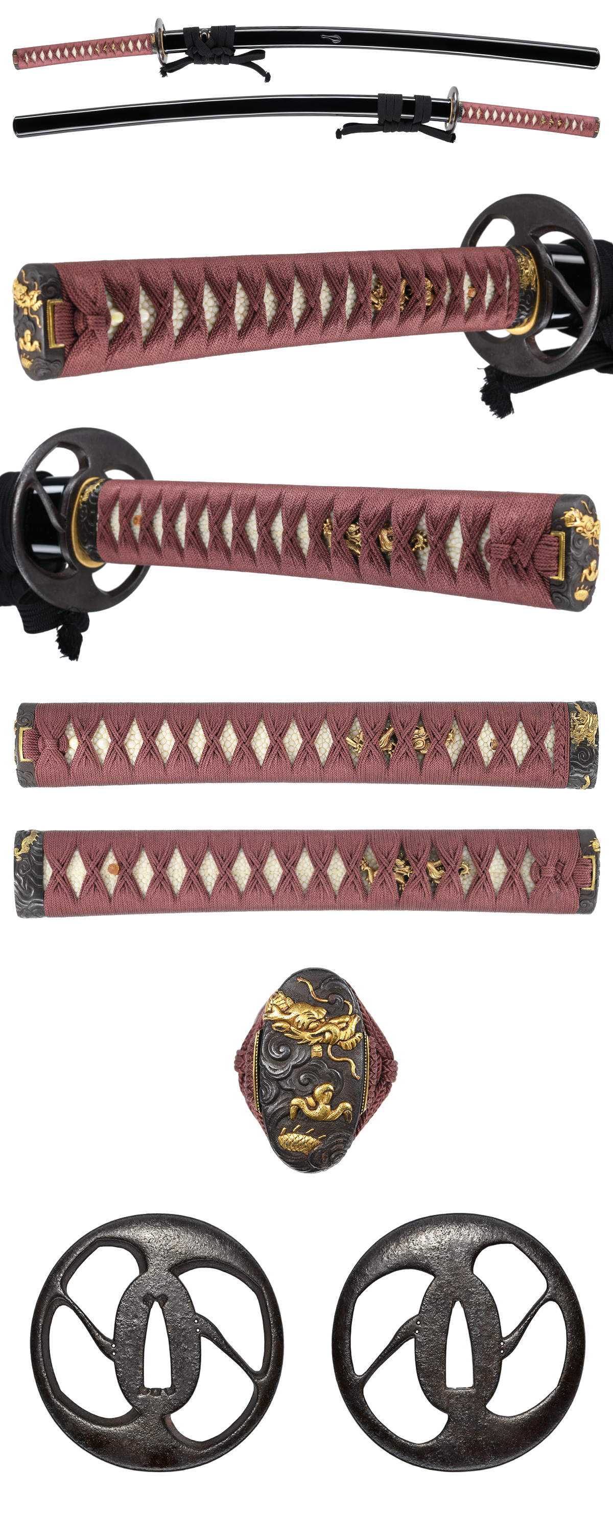 刃長:Blade length(Cutting edge): 70.6cm(二尺三寸二分弱) 反り:Curve(SORI): 1.8cm 元幅:Width at the hamachi(Moto-Haba): 3.06cm 元鎬重:Thickness at the Moto-Kasane: 0.76cm 先幅:Wide at the Kissaki(Saki-Haba): 2.30cm 先鎬重:Thickness at the Saki-Kasane: 0.55cm 拵全長:Length of Koshirae : 約98.5cm 茎:Sword tang(Nakago): 生ぶ、化粧鑢目、目釘孔1個。
