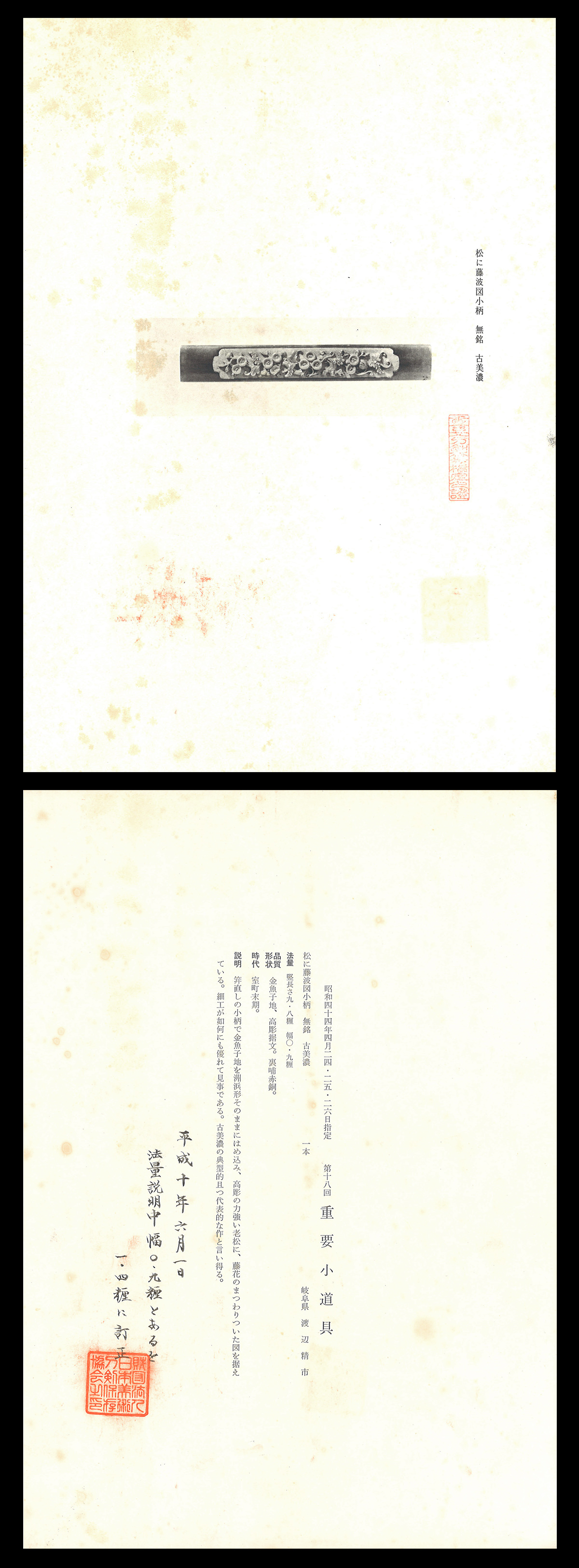 小柄 無銘 古美濃 松に藤波図小柄 第十八回重要小道具