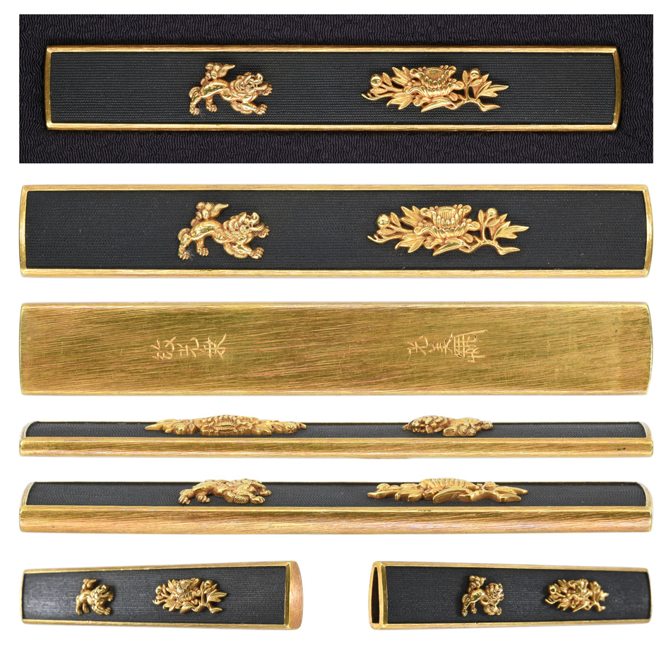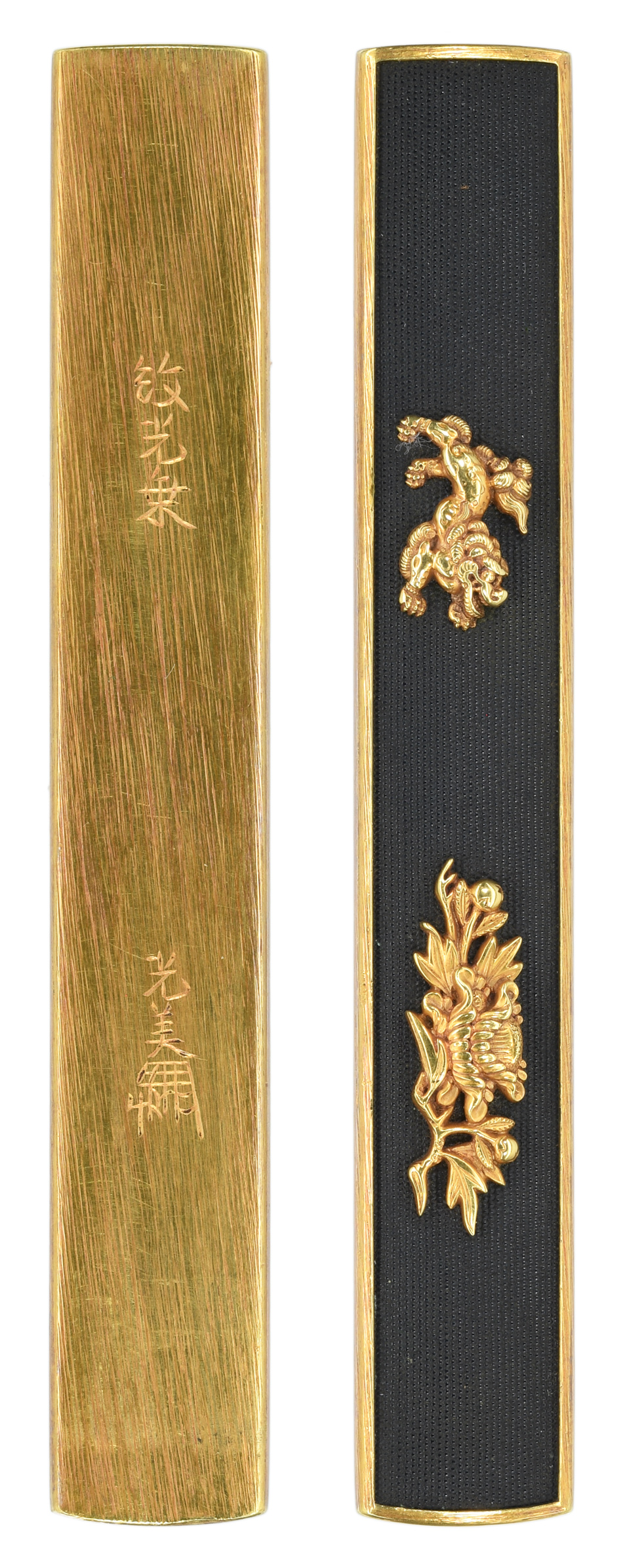 枝牡丹獅子図小柄 赤銅魚子地 金紋 |
