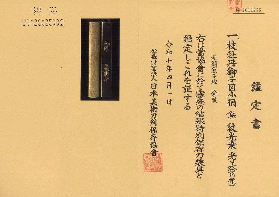 小柄 銘 紋光乗 光美(花押) 枝牡丹獅子図小柄 特別保存刀装具鑑定書