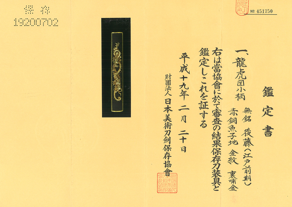 小柄 無銘 後藤(江戸前期) 龍虎図小柄 保存刀装具鑑定書