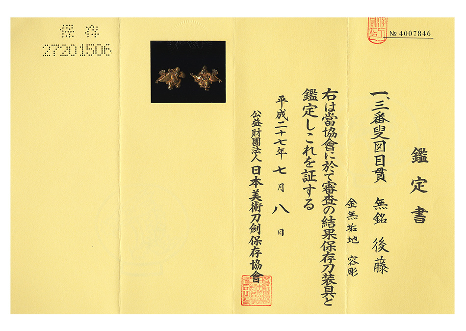 目貫 無銘 後藤 三番叟図目貫 保存刀装具鑑定書