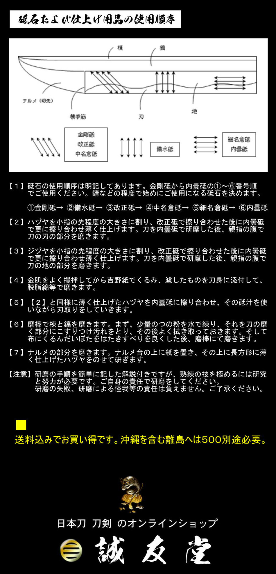 刀剣研摩に必要な各種砥石と仕上げ材料がひとまとめにセットされております。 全てが専門家の方がご使用のものと同質の品揃えです。このセット一式があれば趣味の刀剣研摩をご自宅でお楽しみいただけます。全ての材料が揃って御買い求めやすい価格でご提供します。 |