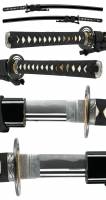 本刀は、刃長が二尺四寸二厘で表裏に樋を彫ります。地鉄は、板目肌柾掛かり肌現れて地沸が付く強い鍛えの地金です。刃文は、丁子乱れ、大小の沸がつき星のように輝きます。刃中には足入り、砂流し金線が盛んに働き覇気があります。帽子は、そのまま乱れて小丸に返ります。茎は丁寧に仕立てられた化粧筋違鑢目に刻銘がきりっと彫られています。本作は人気の現代刀匠、国忠刀匠の上段者向けの居合刀として、もちろん鑑賞刀としてもお奨めの魅力いっぱいの御刀です。黒呂塗鞘打刀拵入、銀着せ一重はばき。