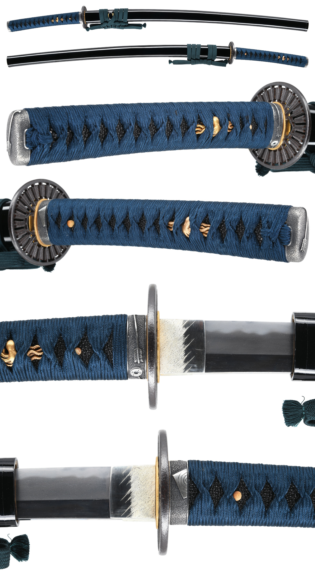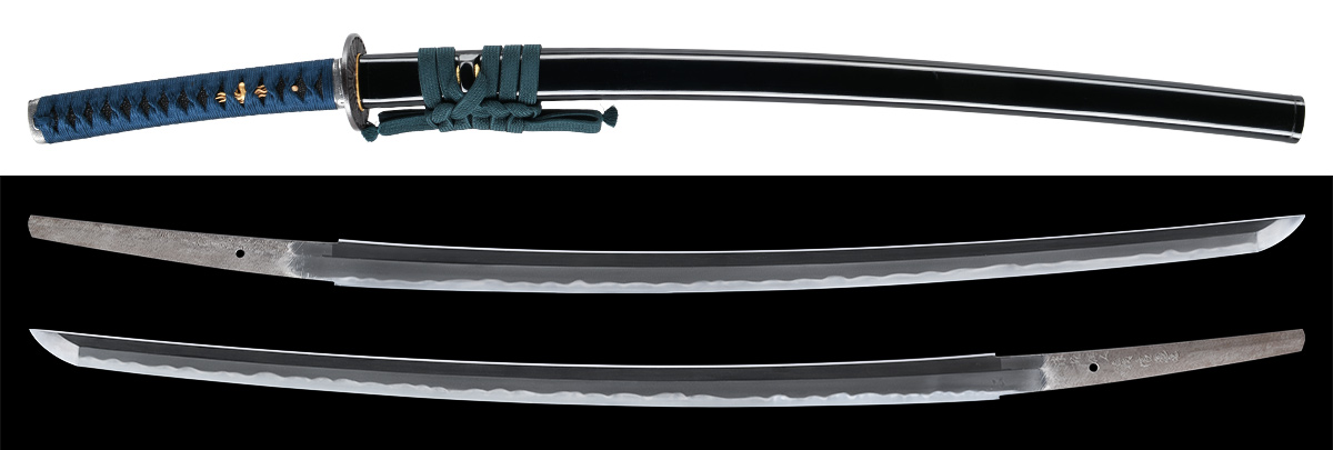 本刀は、刃長が、二尺一寸九分、身幅重ね尋常、反り頃合いで中切っ先となる刀姿です。地鉄はよく練られた小板目肌に地沸が付きます。刃文は互の目を主として尖り刃、丁子が交じり、刃縁に小沸付き、匂口明るく冴えます。帽子は、乱れ込んで返ります。青森県の名門鍛冶 二唐家の四代目 義信の一刀で、同地で連綿と受け継がれた確かな力量が発揮された同工の優品です。銀無垢一重ハバキ、黒蝋色塗鞘打刀拵。