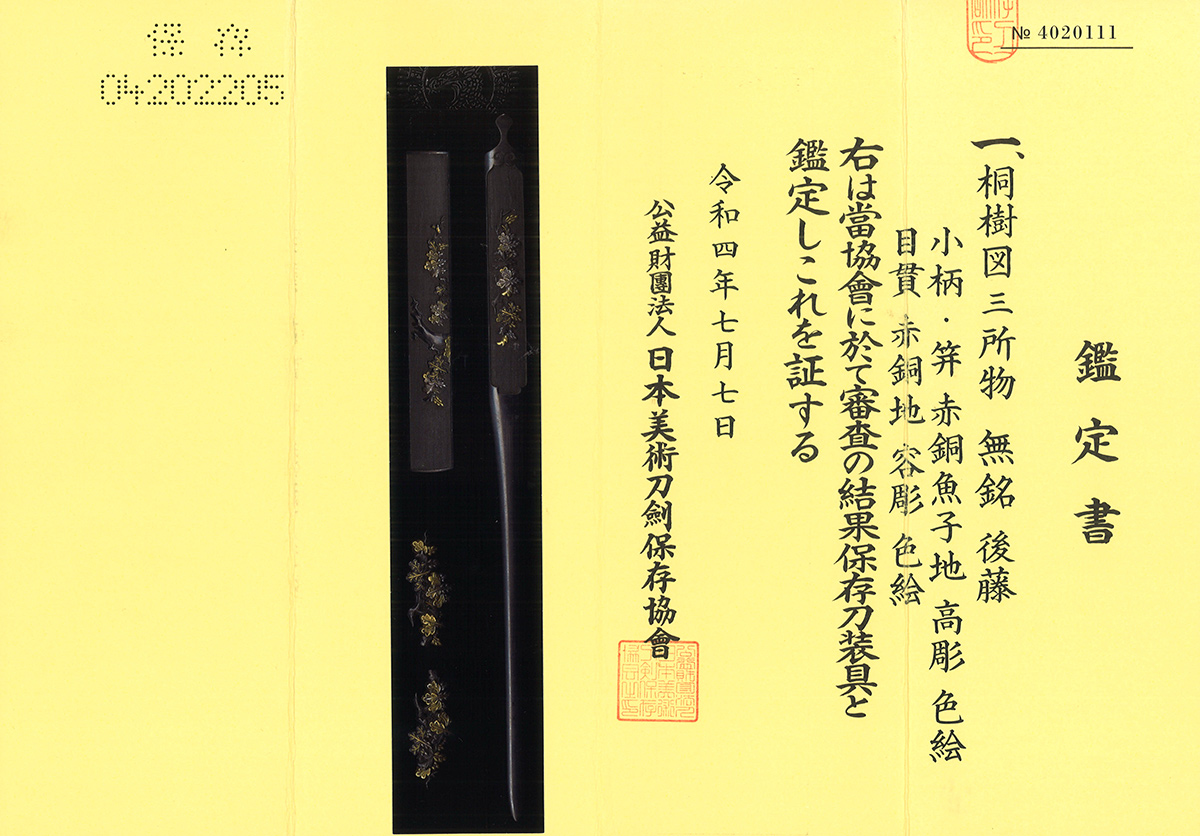三所 無銘 後藤 桐樹図三所 保存刀装具鑑定書