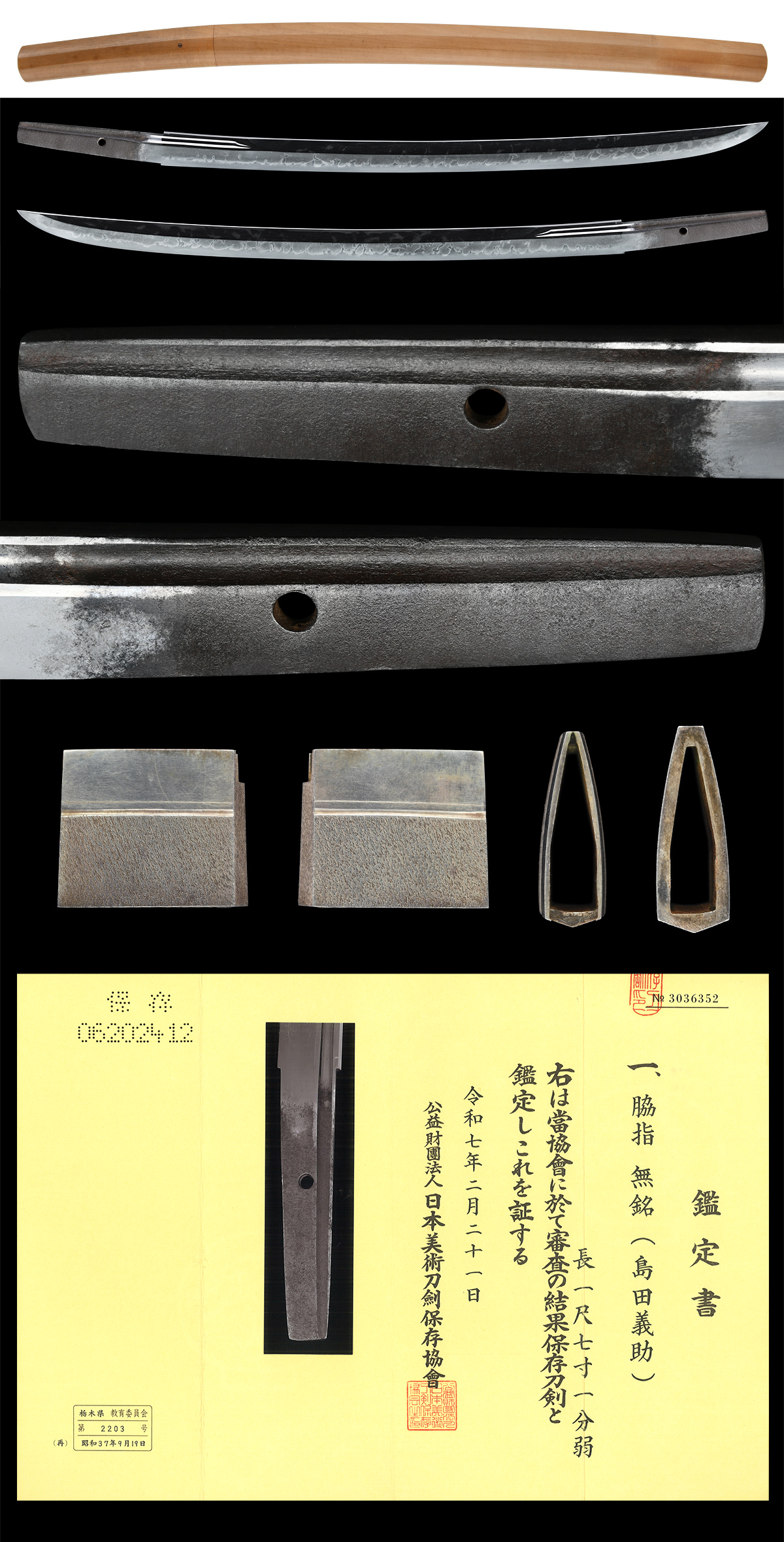 脇差 無銘 島田義助 保存刀剣鑑定書