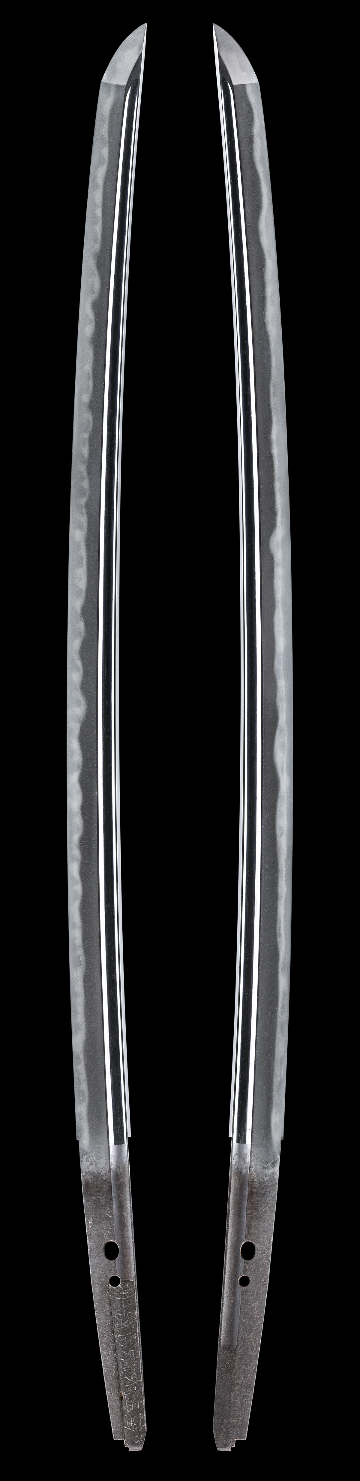 大宮派は、祖である国盛が、鎌倉時代後期から南北朝時代初期にかけて、山城国猪熊通大宮より備前国大宮へ移住したことから始まる一派で、助盛、盛重、盛利、盛景、師景らが代表工とされます。同派は、同時期の備前兼光一門と互いに腕を競い、沸が強く、相伝備前の色濃い作域を示す一方、山城伝の作品もあり、刃文も湾れを基調とした互の目乱れ、蛙子風の刃から、青江風の直刃と多彩です。室町期に近づくと、他の長船物とほぼ同様の作柄となります。初代師景(もろかげ)は、同派盛景の子と伝え、南北朝時代 康暦頃から室町時代初期 応永十二年までの作が残ります。師景は、室町時代中期 永正頃まで四代にわたって代を重ねています。