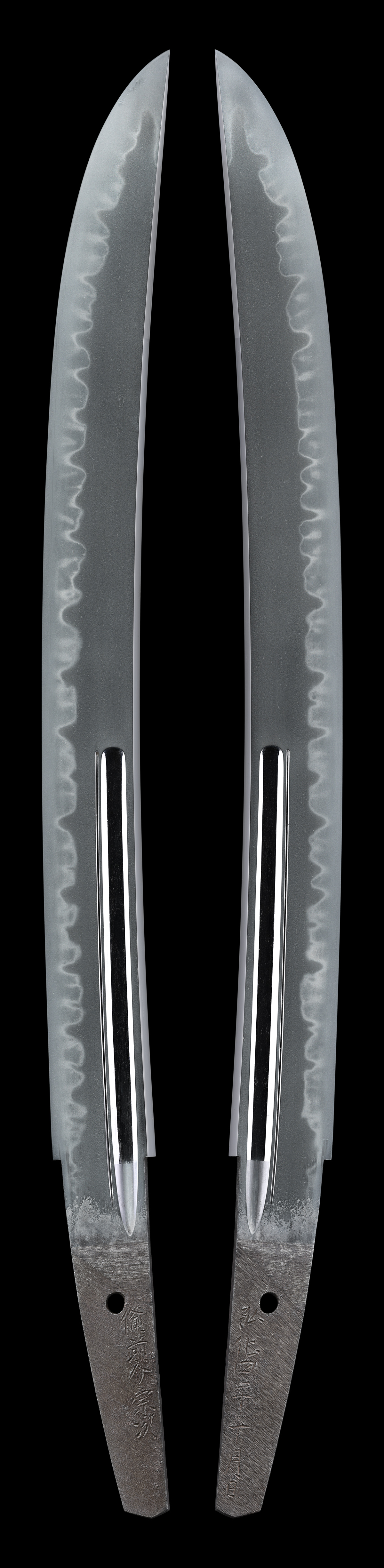 体配:Shape(Taihai): 平造、庵棟 彫物:Engraving: 表裏に腰樋と添樋を掻き流す。 地鉄:Jigane(Hada): 小板目肌。 刃文:Temper patterns(Hamon): 互の目丁子乱れ。 帽子:Temper patterns in the point(Bohshi): 乱れ込み先小丸に返る。 登録:Registration Card: 群馬県 昭和三十年
