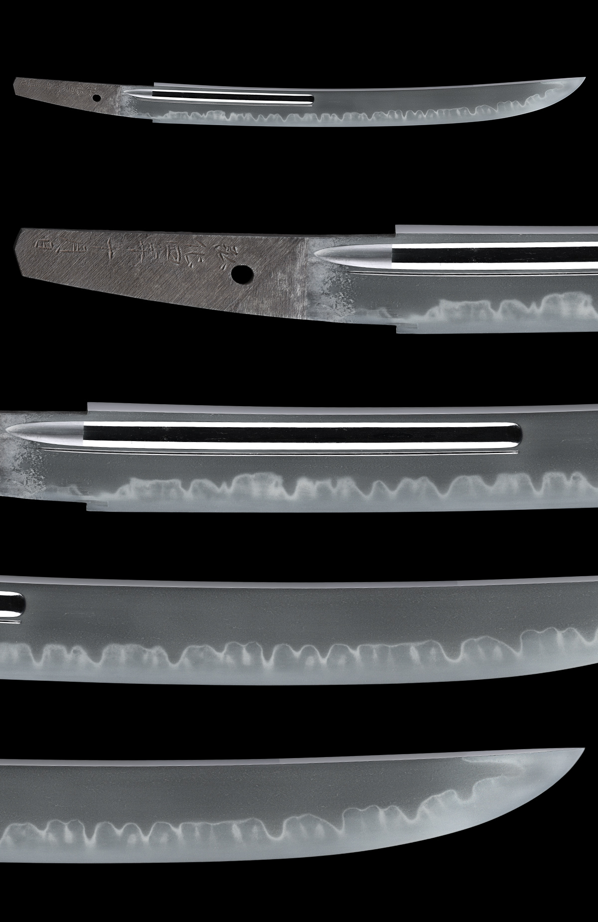 刃長:Blade length(Cutting edge): 約34.8cm(一尺一分五分強) 反り:Curve(SORI): 約0.6cm(二分) 元幅:Width at the hamachi(Moto-Haba): 3.28cm 元鎬重:Thickness at the Moto-Kasane: 0.69cm 先幅:Wide at the Kissaki(Saki-Haba): 3.05cm 先鎬重:Thickness at the Saki-Kasane: 0.60cm 茎:Sword tang(Nakago): 生ぶ、化粧筋違鑢目、目釘孔1個。