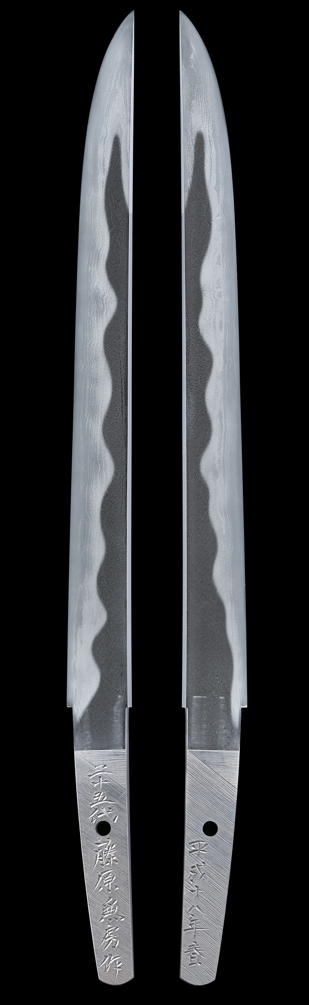 【解説】 二十五代藤原兼房作。本名は加藤賀津雄。昭和三十二年、室町時代より続く刀匠・藤原兼房家に生まれます。岐阜県関市小瀬在住。昭和五十年、人間国宝匠・月山貞一に入門、初銘を貞房といいます。昭和五十七年、文化庁認定の刀匠となります。昭和五十八年より、父二十四代藤原兼房に師事し、以後、薫山賞はじめ、優秀賞、努力賞他、多くの受賞を果たします。昭和五十九年、二十五代藤原兼房日本刀鍛錬道場を開設。二十五代藤原兼房を襲名しました。明治神宮、熱田神宮、靖国神社などに刀を奉納。また天皇家の守短刀を御造りするなど、活発にご活躍中の関鍛冶代表工の御一人です。全日本刀匠会元常務理事。関伝技術保存会元副会長、関伝刀匠会元会長。 本作体配は、刃長が七寸七分。平造姿の短刀です。地鉄は板目肌良く詰み、鍛に沿って地景太く入り、地沸よく付く、鉄の冴えた精緻な肌合いを呈します。刃文は沸出来の互の目丁子乱れで、焼刃全体に頻りに砂流し、金筋がかかり、大変覇気のある焼刃で、匂口良く冴えます。帽子はそのまま乱れ込み先掃きかけて返ります。本作、室町期より続く関鍛冶の名門、藤原兼房家二十五代目兼房の一口。相州物を思わせる力強い地刃が魅力の御刀です。白鞘、金鍍金二重はばき。