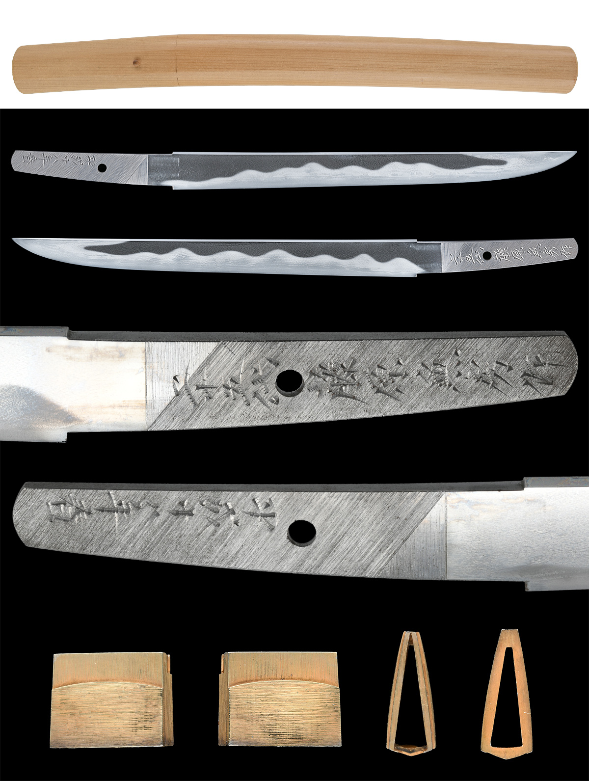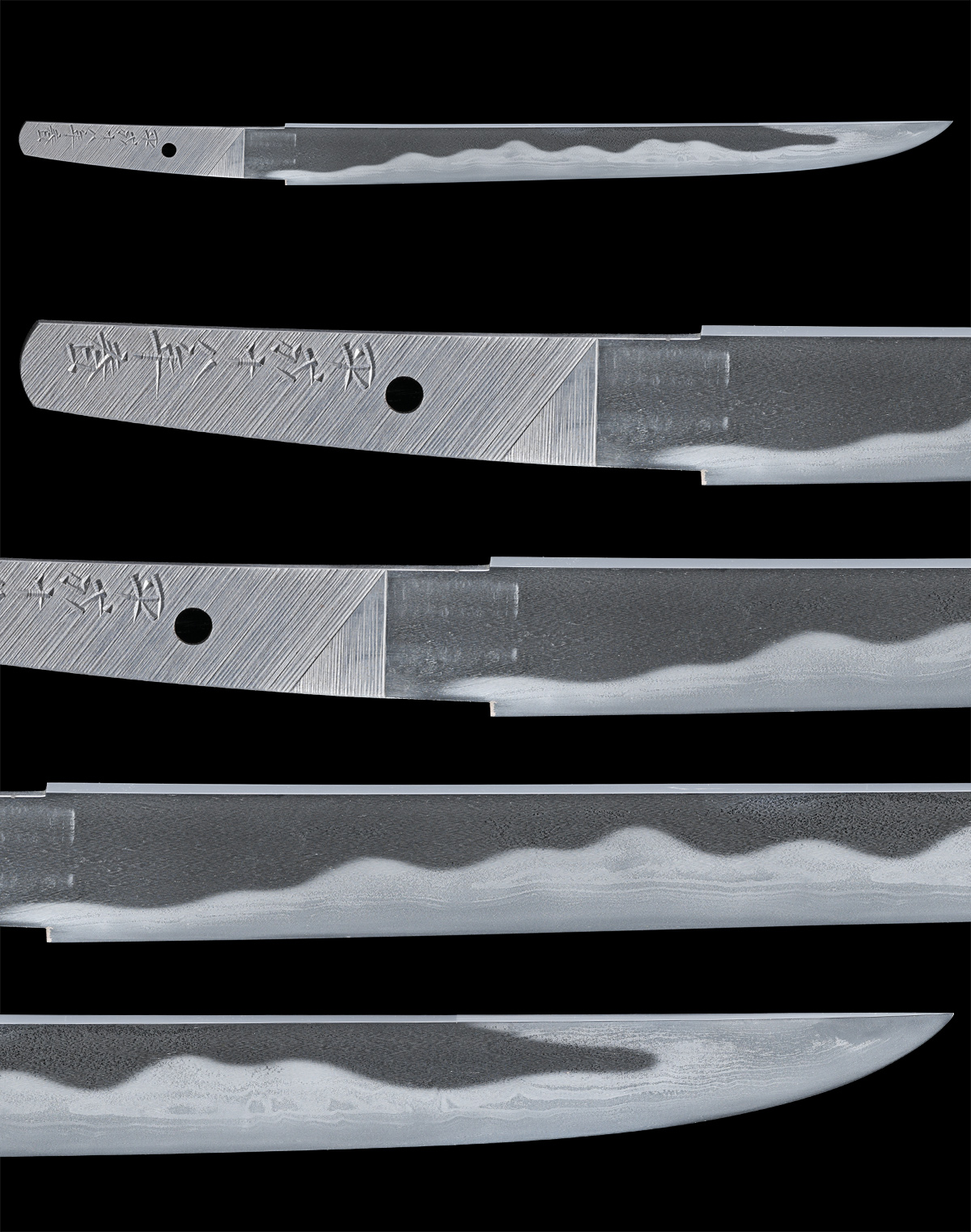 体配:Shape(Taihai): 平造、庵棟。 地鉄:Jigane(Hada): 板目肌良く詰み、地沸、太く地景掛かる。 刃文:Temper patterns(Hamon): 互の目丁子乱れ、砂流し、金筋頻りに掛かる。 帽子:Temper patterns in the point(Bohshi): 乱れ込み先掃きかけて返る。 登録:Registration Card: 岐阜県
