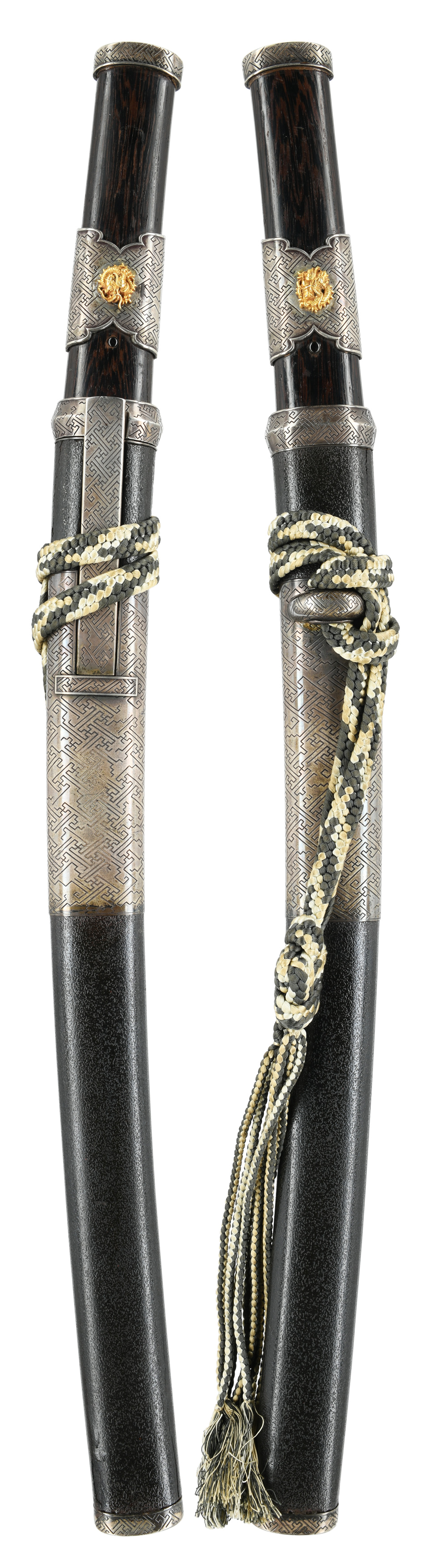 刃長:Blade length(Cutting edge): 32.7cm(一尺五分) 反り:Curve(SORI): 0.4cm 形状 平造、三つ棟、身幅広く重ね薄く僅かに反りつき、大振りの出来である。 鍛 小板目肌、地沸よくつき、映りごころがある。 刃文 直刃、小沸つき、匂口締りごころとなる。 帽子 直ぐにのたれごころがあり、先小丸、返りは長い。 彫物 表裏に刀樋を掻き流す。 茎 生ぶ先栗尻、鑢目勝手下り、目釘孔二、指表に来国光観応、裏に本阿(花押)光遜の金粉銘がある。 |