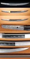 【解説】 本作は、故、宮入行平の門人である渡邊繁平の作品です。本名は繁美。新潟県南魚沼郡の刀匠です。昭和17年生まれ。昭和40年に宮入行平師に入門。作刀承認が得られた、昭和46年の第7回新作名刀展に初出品して、見事初入選して以来、優秀賞、奨励賞、努力賞4回受賞。入選はなんと12回を数えます。大変腕前の高い刀匠ということになります。 本刀は大きく鋭い鋒が目を引く、清磨のオソラク造り写し短刀です。オソラク造とは、室町時代末期の駿河の刀匠 島田義助 の刀に、武田信玄のために造ったと言われる大帽子の小脇指があり、 その刀身に “おそらく” と彫られているところから命名されたもので、帽子が刀身の半分以上あるのが特徴です。清磨のオソラク造は有名で、鋭い切先を見ていると、いかにも物切れしそうな様相で怖くなります。本作品、繁平がこれら特徴をよくおさえて上手に表現している大迫力の一振りです。地鉄はよく詰んでスッキリとした肌合いを見せています。派手に乱れた互の目刃には、沸(にえ)が強く付き、金線、砂流しがしきりに掛かり働きは抜群です。30センチに迫ろうかという延びた短刀で、そのずっしりとした重量感は好ましい限りです。上出来、清磨写しのオソラク造短刀です。御探し御客様は多いと思います。金着せ一重はばき。